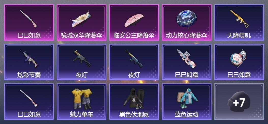 Kar98K-巳巳如意,SCAR-L-炫彩節奏,AC-VAL-天降萌嘰,UMP45-夜燈,P90-巳巳如意,S686-巳巳如意,S12K-夜燈,破片手榴彈-巳巳如意