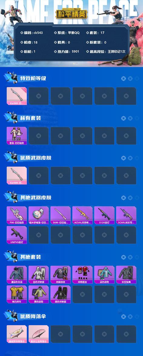 ck543-【商品標題】:蘋果 手Q-0粉裝-1特效槍-0載具-5901熱力值--1印記-17套裝-18槍皮