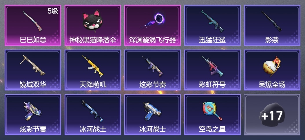 Kar98K-巳巳如意,SCAR-L-炫彩節奏,QBZ-彩虹符號,M762-天降萌嘰,M24-影襲,M200-宇宙意志,SKS-迅猛狂鯊,Mk14-冰河戰士,UZI-冰河戰士,UZI-炫彩節奏,MG3-鏡域雙華,平底鍋-空島之星,破片手榴彈-呆爆全場