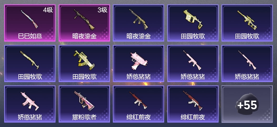 Kar98K-巳巳如意,DP-28-暗夜鎏金,M416-緋紅前夜,GROZA-田園牧歌,AUG-耀粉歌者,M762-緋紅前夜,蜜獾-嬌憨豬豬,VSS-田園牧歌,SLR-嬌憨豬豬,UZI-嬌憨豬豬,Vector-田園牧歌,湯姆遜-暗夜鎏金,S12K-嬌憨豬豬,SPAS-12-田園牧歌,Mk47-烏木金紋,AKM-彩虹符號,UMP45-生命誓言,Vector-生命誓言,M416-糯團青竹,AKM-灼熱熔岩,AC-VAL-烏木金紋,M416-藍色火焰,Mk14-烏木金紋,MG3-烏木金紋,SCAR-L-玉兔迎春,平底鍋-嬌憨豬豬,M16A4-幻世戰舞者,莫辛納甘-烏木金紋,MG3-幻世戰舞者,UZI-炫彩節奏,AKM-破曉戰魂,S12K-幻世戰舞者,AKM-虎虎生威,平底鍋-田園牧歌,平底鍋-光之冒險,平底鍋-緋紅前夜,M249-糯團青竹,PKM-啾咪啾咪,撬棍-幻世戰舞者,撬棍-緋紅前夜