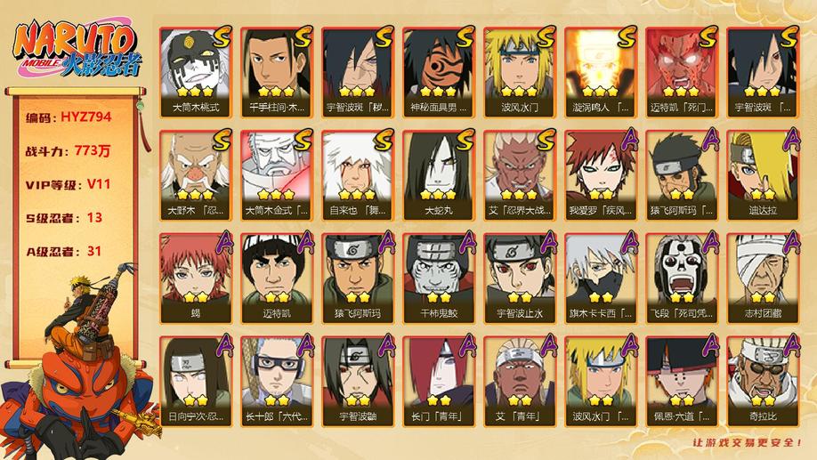 【HYZ794】V11/戰力773W/S忍13/A忍31/水門/博人傳桃式/忍戰大野木/金式/大蛇丸/死門凱/創立柱間/紅夜帶土/九鳴人/穢土解斑/創立斑/舞之豪傑自來也/忍戰艾/青年艾/青年水門/迪達拉/曉大蛇丸/死司飛段/鬼鮫/凱/漂泊六道/萬花筒卡卡西/奇拉比/忍戰丁次/近松十人衛千代/忍戰寧次/漂泊再不斬/疾風傳我愛羅/桃式顯現博人/蠍/穢土阿斯瑪/阿斯瑪/止水/鼬/博人傳木葉丸/須佐佐助
