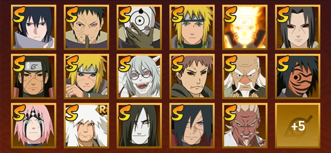水門,穢土水門,忍戰櫻,忍戰大野木,大蛇丸,四代風影,穢土柱間,紅夜帶土,九喇嘛鳴人,永恆萬花筒佐助,穢土解斑,忍戰帶土,穢土鼬,仙人兜,舞之豪傑自來也,忍戰艾,白面具,漂泊扉間,九尾鳴人,泳裝小南,漂泊小南,新春止水