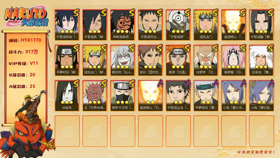 【HYX1770】V11/戰力917W/S忍20/A忍25/水門/穢土水門/忍戰櫻/忍戰大野木/大蛇丸/四代風影/天道/穢土柱間/紅夜帶土/九鳴人/永恆萬花筒佐助/穢土解斑/忍戰帶土/穢土鼬/仙人兜/舞之豪傑自來也/忍戰艾/白面具/3星旗木卡卡西「須佐能乎」/漂泊扉間/九尾鳴人/泳裝小南/漂泊小南/新春止水/熊貓