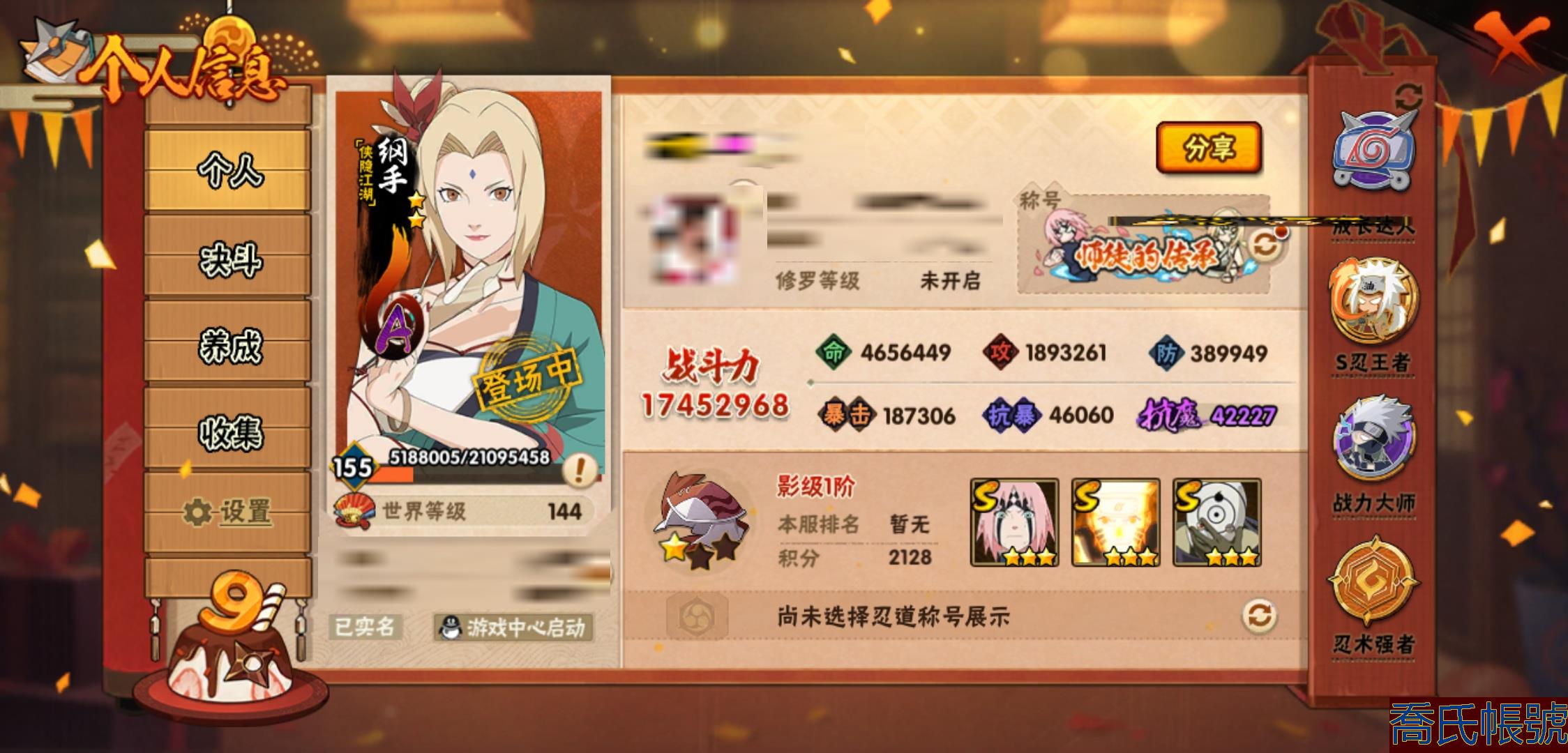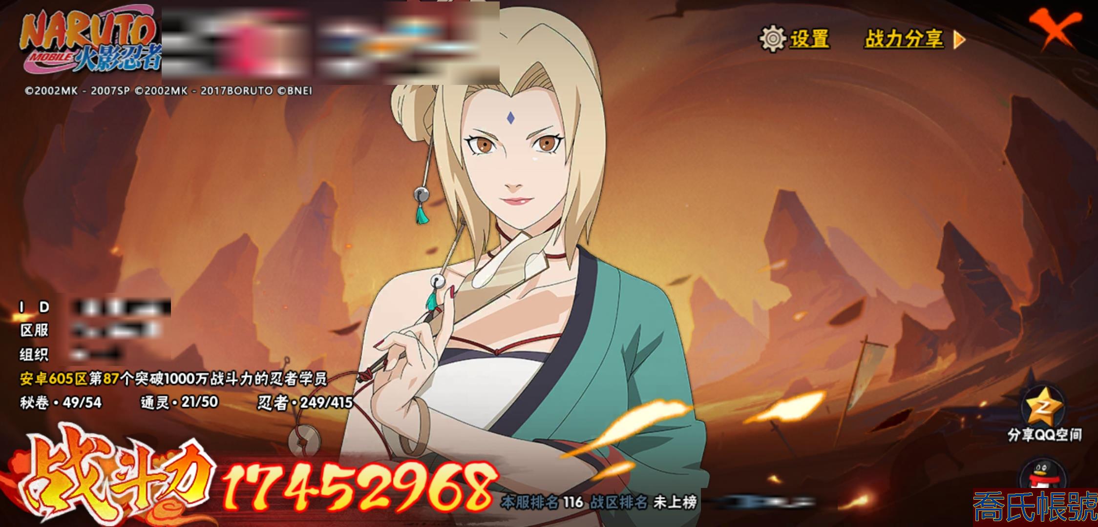 【OBHXDNK903842】戰鬥力:1745W+;段位:影級1階;本服排名:116;戰區排名:未上榜;VIP12級;S忍35個;A忍46個;通靈獸21個;S忍:綱手(5星),大蛇丸(4星),猿飛日斬(4星),須佐能乎宇智波鼬(4星),穢土轉生宇智波鼬(4星),九喇嘛連結漩渦鳴人,永恆萬花筒宇智波佐助,忍界大戰春野櫻,須佐能乎旗木卡卡西,自來也,仙人模式自來也,舞之豪傑自來也,百豪綱手,死門邁特凱,波風水門,九喇嘛連結波風水門,穢土轉生波風水門,穢土轉生猿飛日斬,穢土轉生千手扉間,穢土轉生千手柱間,穢土轉生宇智波斑,宇智波斑,神秘面具男,白面具宇智波斑,忍界大戰宇智波帶土,四代目風影羅砂,穢土轉生金角銀角,三代目土影大野木,二代目土影無,穢土轉生半藏,天道佩恩,超佩恩天道,穢土轉生長門,仙人模式藥師兜,大筒木金式;A忍:邁特凱(5星),猿飛阿斯瑪(5星),蠍(5星),幹柿鬼鮫(5星),飛段(4星),疾風傳我愛羅(4星),仙人模式漩渦鳴人(3星),四代目土影黑土(3星),初始形態機械鳴人,九尾查克拉漩渦鳴人,萬花筒寫輪眼宇智波佐助,須佐能乎宇智波佐助,宇智波泉奈,百豪春野櫻,忍界大戰秋道丁次,幻之真容旗木卡卡西,萬花筒寫輪眼旗木卡卡西,宇智波止水,青年波風水門,忍界大戰我愛羅,近松十人衛千代,五代目水影照美冥,漂泊武士桃地再不斬,穢土轉生桃地再不斬,桃地再不斬,忍界大戰奇拉比,忍界大戰土臺,俠隱江湖綱手,漂泊武士千手扉間,半蛇斗篷藥師兜,青年長門,小南,角都,地怨虞角都,曉大蛇丸,緋流琥蠍,宇智波鼬,新春限定宇智波鼬,迪達拉,穢土轉生迪達拉,死司憑血飛段,俠隱江湖大野木,羈絆神農,猿飛木葉丸,六代目水影長十郎,五代目雷影達魯伊;通靈獸:忍犬,藍蛇,蛤蟆吉,忍龜,鐮鼬,猿魔,山椒魚,蜃,蛞蝓,熊貓,蛤蟆仙人,鮫鯊,蛤蟆健,烏鴉,蛤蟆龍,二尾又旅,蛤蟆廣,砂之守鶴,夢貘,鷹,蜘蛛;時裝:百戰大蛇丸,百戰宇智波鼬須佐能乎,狂野鮫鯊幹柿鬼鮫,百戰波風水門,百戰佩恩天道,蜀面豪傑舞之豪傑自來也,冷玉豪情綱手俠隱江湖,太極靈韻日向花火武當宗師,龍的傳人李洛克截拳宗師,編織虛實宇智波鼬,緋櫻綻放春野櫻百豪,剎那的藝術迪達拉,可愛睡衣漩渦鳴人,純白之心白,隱藏內心的面具旗木卡卡西暗部,烈土霓裳黑土四代目土影,風靈素錦猿飛未來,火之意志綱手百豪;【605】有一個王者連體號,v7,有省標。火影有2個忍法帖快出了。價格可以小砍