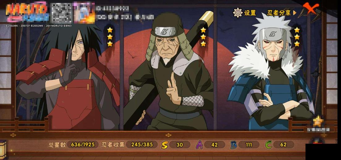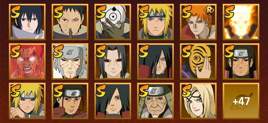 穢土長門,穢土日斬,穢土水門,穢土扉間,穢土柱間,穢土鼬,穢土斑,穢土解斑,忍戰櫻,忍戰帶土,忍戰艾,創立柱間,四代雷影,自來也,舞之豪傑自來也,大蛇丸,百豪綱手,柱間,斑,水門,神秘面具男,紅夜帶土,九喇嘛鳴人,死門凱,天道超,永恆萬花筒佐助,白面具,金式,凱,阿斯瑪,鬼鮫,疾風傳我愛羅,蠍,飛段,死司飛段,桃式顯現博人,仙人鳴人,九尾鳴人,萬花筒佐助,須佐佐助,百豪櫻,忍戰丁次,忍戰寧次,最終章雛田,萬花筒卡卡西,止水,青年水門,忍戰我愛羅,近松十人衛千代,五代水影,忍戰奇拉比,奇拉比,青年艾,斗篷兜,不緣,青年長門,小南,曉創生角都,地怨虞角都,曉大蛇丸,鼬,迪達拉,穢土迪達拉,六代水影