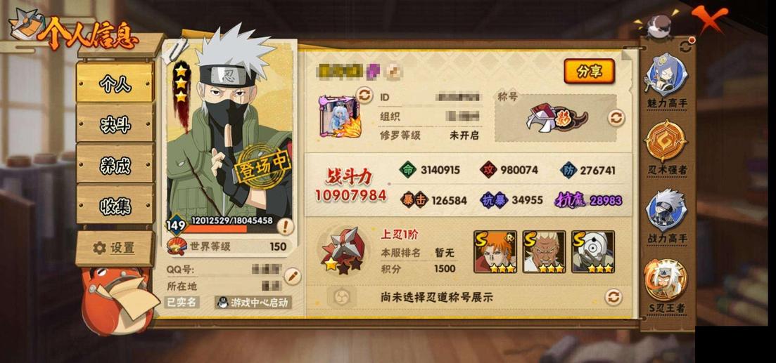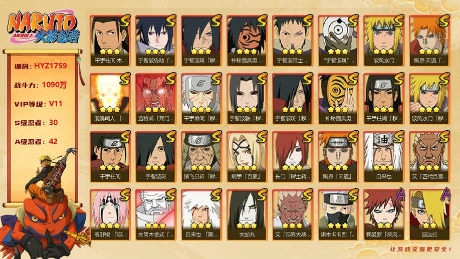 【HYZ1759】V11/戰力1090W/S忍30/A忍42/穢土斑/百豪綱手/疾風傳我愛羅/死司飛段/止水/2星藥師兜「俠影江湖」/3星旗木卡卡西「須佐能乎」/斑/穢土日斬/五代水影/自來也/忍戰奇拉比/穢土扉間/創立柱間/六代水影/百豪櫻/白面具/死門凱/柱間/天道超/曉創生角都/斗篷兜/穢土迪達拉/飛段/阿斯瑪/忍戰櫻/萬花筒佐助/忍戰我愛羅/迪達拉/小南/九尾鳴人/不緣/神秘面具男/曉大蛇