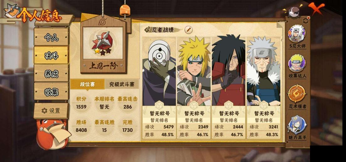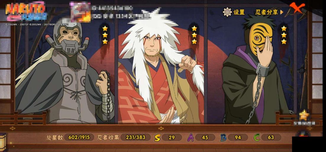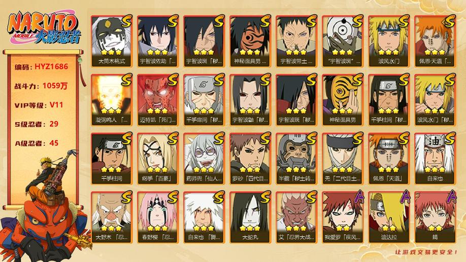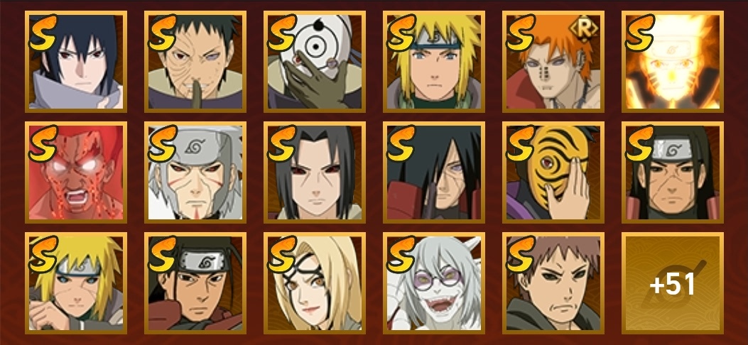 穢土半藏,穢土水門,穢土扉間,穢土柱間,穢土鼬,穢土斑,穢土解斑,忍戰大野木,忍戰櫻,忍戰帶土,忍戰艾,二代土影,四代風影,自來也,舞之豪傑自來也,大蛇丸,百豪綱手,柱間,水門,仙人兜,神秘面具男,紅夜帶土,九喇嘛鳴人,死門凱,天道超,永恆萬花筒佐助,白面具,博人傳桃式,凱,阿斯瑪,鬼鮫,疾風傳我愛羅,蠍,飛段,青年水門,仙人鳴人,九尾鳴人,萬花筒佐助,須佐佐助,疾風傳咒印佐助,百豪櫻,忍戰丁次,忍戰寧次,最終章雛田,真容卡卡西,萬花筒卡卡西,地陸,止水,忍戰我愛羅,近松十人衛千代,五代水影,忍戰奇拉比,奇拉比,青年艾,三船,斗篷兜,青年長門,小南,泳裝小南,漂泊小南,曉大蛇丸,鼬,新春鼬,迪達拉,穢土迪達拉,死司飛段,六代水影,桃式顯現博人