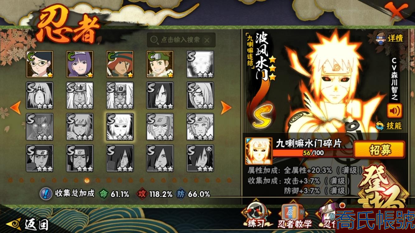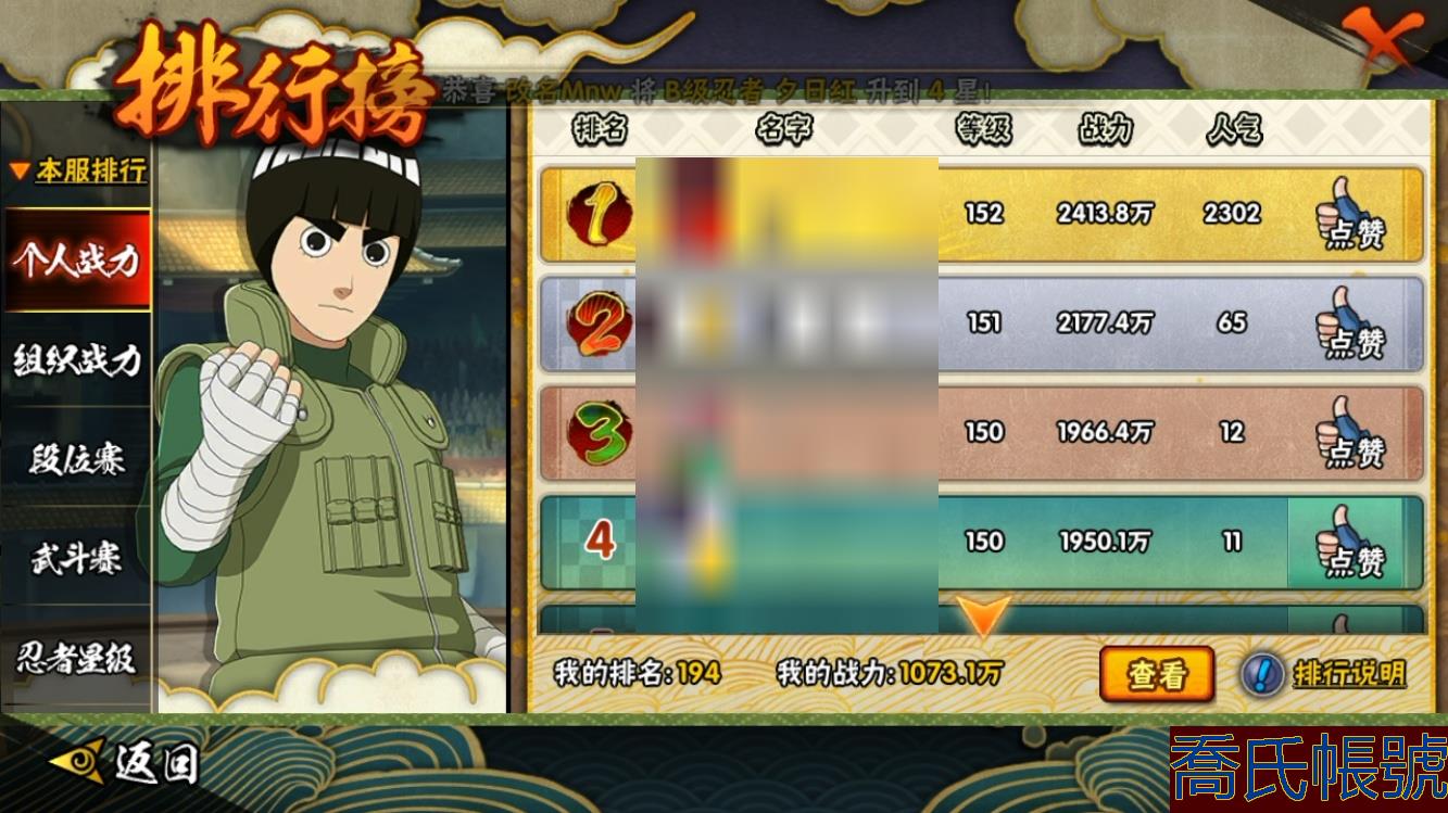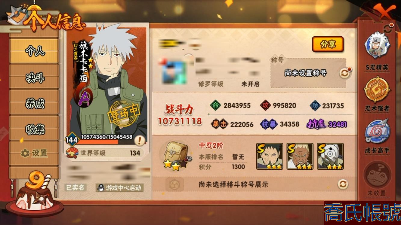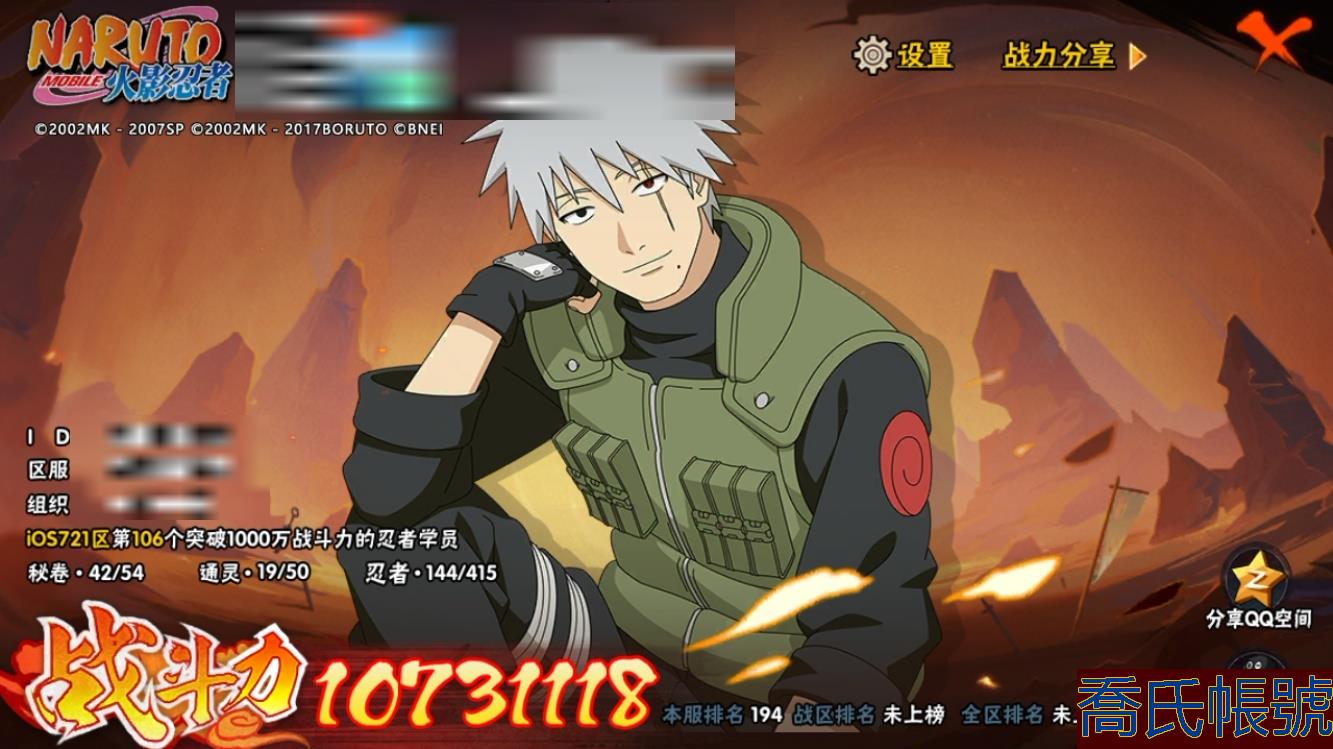 【OBHCRPR213242】戰鬥力:1073W+;段位:中忍2階;本服排名:194;戰區排名:未上榜;VIPM1級;S忍19個;A忍25個;通靈獸19個;S忍:須佐能乎旗木卡卡西,穢土轉生解宇智波斑,須佐能乎宇智波止水,綱手,永恆萬花筒宇智波佐助,須佐能乎宇智波鼬,暴怒第六尾漩渦鳴人,忍界大戰艾,波風水門,大筒木桃式,猿飛日斬,忍界大戰宇智波帶土,天道佩恩,白面具宇智波斑,傳說中的三忍自來也,穢土轉生猿飛日斬,木葉創立千手柱間,最終章大筒木舍人,舞之豪傑自來也;A忍:邁特凱,猿飛阿斯瑪,幹柿鬼鮫,疾風傳我愛羅,蠍,萬花筒寫輪眼宇智波佐助,須佐能乎宇智波佐助,宇智波泉奈,忍界大戰秋道丁次,忍界大戰日向寧次,忍界大戰李洛克,最終章日向雛田,幻之真容旗木卡卡西,近松十人衛千代,穢土轉生桃地再不斬,忍界大戰土臺,緋流琥蠍,宇智波鼬,迪達拉,飛段,死司憑血飛段,羈絆神農,六代目水影長十郎,桃式顯現漩渦博人,四代目土影黑土;通靈獸:忍犬,藍蛇,蛤蟆吉,砂之守鶴,忍龜,鐮鼬,猿魔,山椒魚,蛞蝓,蜃,蛤蟆仙人,鮫鯊,蛤蟆龍,辛牙,蛤蟆健,烏鴉,熊貓,蛤蟆廣,夢貘;時裝:百戰波風水門,百戰宇智波鼬須佐能乎,蜀面豪傑舞之豪傑自來也,百戰佩恩天道,太極靈韻日向花火武當宗師,睿勇新星千手扉間少年,驚雷掠影達魯伊五代目雷影,緋櫻綻放春野櫻百豪,熊貓少女天天峨眉宗師,風之守護我愛羅忍界大戰,烈土霓裳黑土四代目土影,血霧怪人幹柿鬼鮫,智勇記者宇智波佐良娜,土之固守大野木三代目土影,飛瀑流泉長十郎六代目水影;【721】【蘋果QQ】