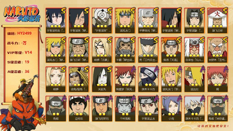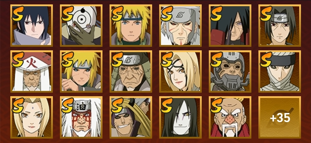 穢土半藏,金角銀角,穢土日斬,穢土水門,穢土扉間,穢土斑,穢土解斑,須佐鼬,二代土影,大野木,仙人自來也,大蛇丸,綱手,百豪綱手,三代火影,水門,永恆萬花筒佐助,白面具,新春水門,青年水門,迪達拉,穢土迪達拉,曉大蛇丸,飛段,死司飛段,鬼鮫,鮫肌融合鬼鮫,角都,地怨虞角都,凱,卡卡西,萬花筒卡卡西,忍戰丁次,近松十人衛千代,忍戰寧次,疾風傳我愛羅,忍戰我愛羅,桃式顯現博人,蠍,小南,仙人鳴人,九尾鳴人,泳裝小南,阿斯瑪,止水,鼬,暴怒帶土,須佐佐助,新春鼬,斗篷兜,六代水影,五代水影