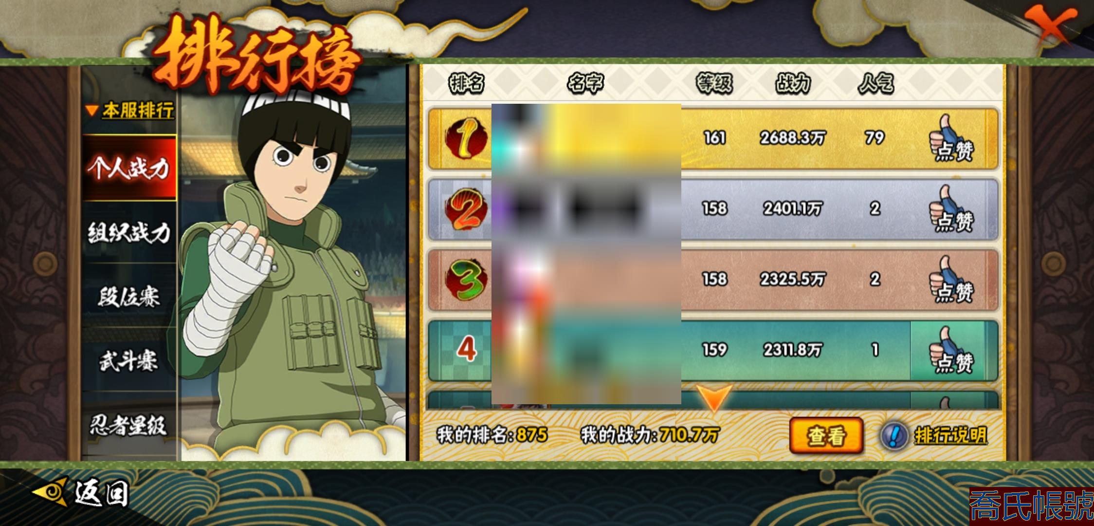 【11等】戰鬥力:1117W+;段位:上忍3階;本服排名:273;戰區排名:未上榜;V