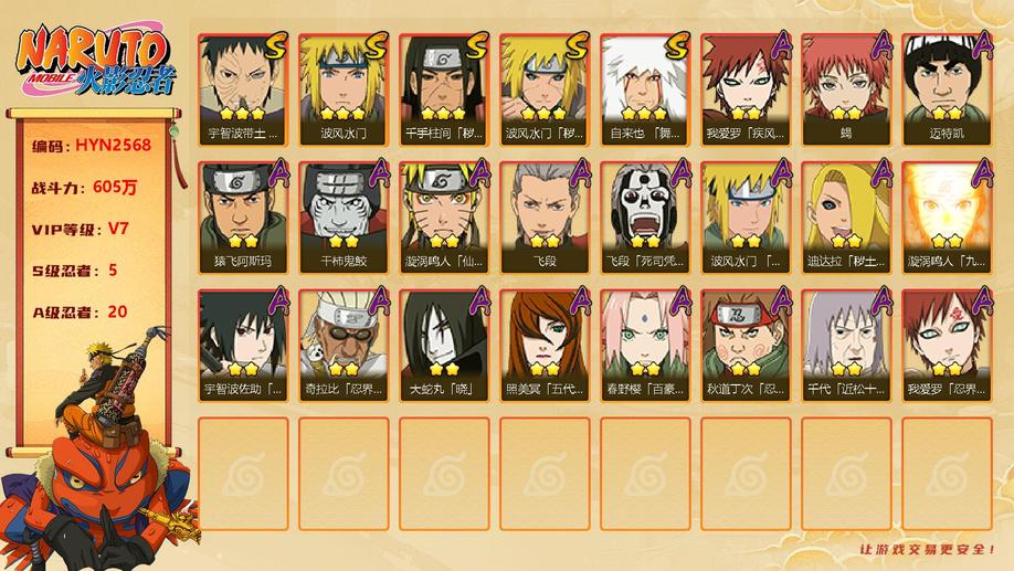 【HYN2568】V7/戰力605W/S忍5/A忍20/通靈獸14/疾風傳我愛羅/雲隱村/死司飛段/凱/忍戰帶土/蠍/五代水影/水門/穢土水門/忍戰丁次/忍戰奇拉比/穢土柱間/青年水門/舞之豪傑自來也/百豪櫻/穢土迪達拉/飛段/仙人鳴人/阿斯瑪/忍戰我愛羅/鬼鮫/九尾鳴人/須佐佐助/近松十人衛千代/曉大蛇丸