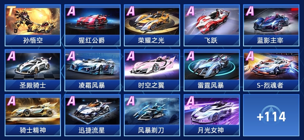 新手賽車,小哈,聖光使者,帝王,刺客,積木,甜心號,飛躍,金剛狼,大Q吧,暴風勇士,南瓜車,愛神之吻,猩紅公爵,月光女神,愛神之心,藍影主宰,聖殿騎士,榮耀之光,極速大Q吧,大黃鴨,時空之翼,凌霜風暴,熾願,迅捷流星,騎士精神,S-烈魂者,雷霆風暴,勁霸,風暴剃刀,白馬王子,裂空,狂獅,柯星出擊,2週年燃魂,極鼠先鋒,神風玉堂,勞斯萊斯曜影,童趣單車,探索者-X,S-逐星者,永夜君主,天狼星,深藍耀世,噬火,S-裁決者,鱷霸,3週年光輝,暗蛟,邁凱倫600LT,犀甲獸,尖兵阿爾法,御炎神兵,雷諾,銀河之光,探影,蠻天,幻天流影,噬天饕餮,凌天,蠻騎,3週年無畏,撼天炎騎,弒影,赤火流星,弒鋒,奔雷聖衛,裂地玄甲,星海幻翼,星夢薔薇,玩家國度,霹靂戰驅,智慧女神,黃金射手座,S-天行者,天馬幻想,紫焰鎧甲,天馬流星,鱷寶,代號:律,永耀紀元,蘭博基尼傳奇,金剛鎧影,蔚藍迷夢,逐夢號,甜心凱蒂,赤焰天啟,川麻高手,天府茶影,狸夢幻想,築夢狸想,神影,伊修扎克-蘭德爾,藍翔挖掘機,孫悟空,白桃戀人,春戀花車,破曉晨星,卡羅拉 銳放,星河戰刃,熾耀曙光,筋斗雲,蜜戀之風,晶鑽星爵,美猴王,盛夏冰甜,黃河守衛,星創·鴻,迅龍,奶油巴達獸,閃耀之星,學霸,凱美瑞,審判之矛,熾戀,大福蘆,織夢,瑪莎拉蒂MC20 Cielo,幻光魅影,墨染青花,AE86,藤原豆腐,羊羊得意,布加迪BOLIDE,星河逐影,阿斯頓馬丁Valkyrie,夜宴,花漾甜心