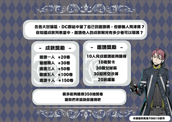 邀請一人 +20卷 邀請兩人 +30卷 邀請三人 +50卷 邀請五人 +100卷 邀請十人 +150卷 | 10人完成邀請能夠獲得 70抽獎卷 30魔女秘藥 30超時空沙漏 20跳躍星 10複製卷(3/25更新後調整) |
