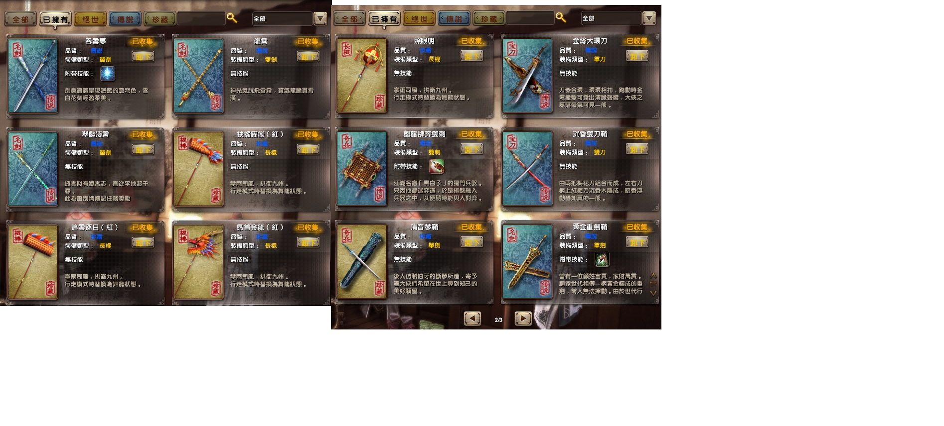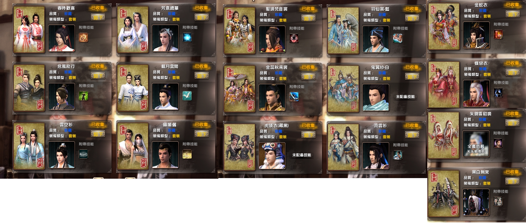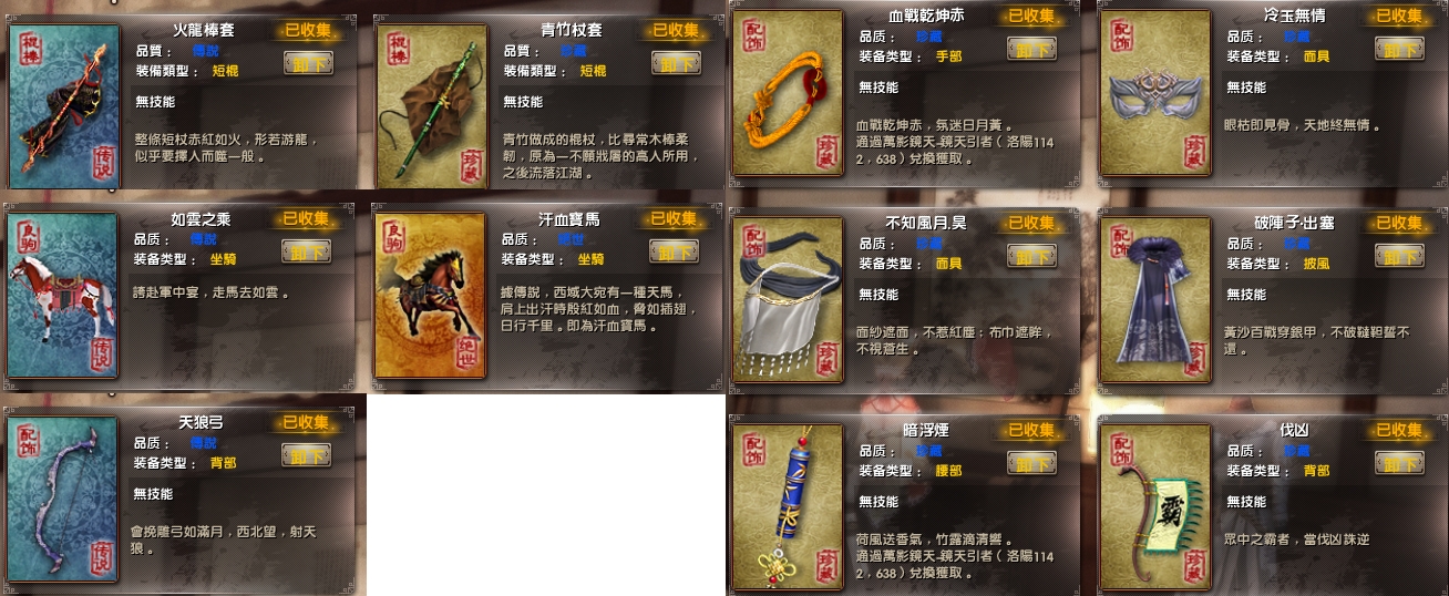 風物誌衣服16套 風物誌武器三星8把 風物誌馬2批(如雲之乘 汗血寶馬-絕世)