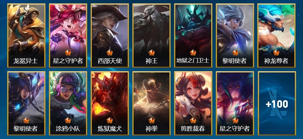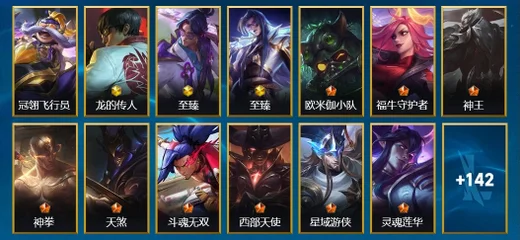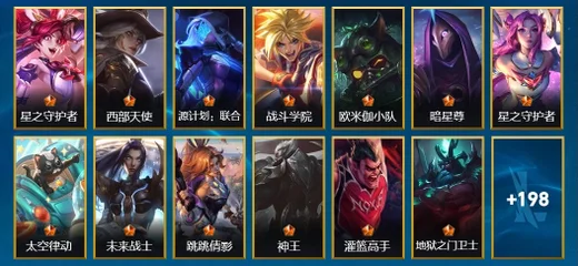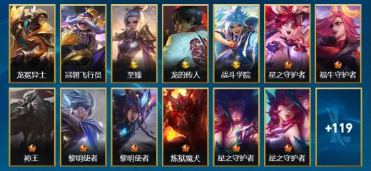 崔斯特-腥紅之月,崔斯特-王牌艦長,崔斯特-星域遊俠,崔斯特-探戈靈魂,賽娜-星之守護者,賽娜-西部天使,賽娜-真實傷害,菲奧娜-皇家守衛,菲奧娜-緋金麗刃,菲奧娜-源計劃:火,阿木木-小小騎士,阿木木-殤之機器人,阿木木-驚悚派對,凱南-奈落之炎,凱南-腥紅之月,凱南-刺客信條,璐璐-光耀之靈,璐璐-邪惡女巫,璐璐-寒冬精靈,阿狸-偶像歌手,阿狸-星之守護者,阿狸-K/DA ALL OUT,蔚-燎原烈焰,蔚-女警官,薇恩-光明哨兵,薇恩-獵龍勇士,奧莉安娜-光耀之心,奧莉安娜-哥特女僕,德萊厄斯-熱血班長,德萊厄斯-神王,格雷福斯-無情重炮,格雷福斯-絕命機甲,蕾歐娜-源計劃:山,蕾歐娜-燒烤女神,阿卡麗-銀色之牙,阿卡麗-源計劃:暗影,盧錫安-西部魔影,盧錫安-絕命槍手,內瑟斯-煉獄魔犬,內瑟斯-創世魔神,拉莫斯-制勝金球,拉莫斯-熔火之心,雷克頓-枯萎之壤,雷克頓-泳池派對,金克絲-光耀之芒,金克絲-星之守護者,艾希-女皇,艾希-西部天使,凱特琳-鐵血狙擊手,凱特琳-踏春來,阿利斯塔-黑暗騎士,阿利斯塔-哞利斯塔,卡特琳娜-戰鬥學院,卡特琳娜-源計劃:雄心,燼-龍冕異士,燼-滅跡行者,奧拉夫-獵龍勇士,奧拉夫-黑暗騎士,亞索-西部牛仔,亞索-黑夜使者,加里奧-風執事,加里奧-地獄之門衛士,莫甘娜-玉劍傳說 蒼鸞,莫甘娜-刀鋒女王,古拉加斯-碎桶者,古拉加斯-飛車暴走族,伊芙琳-緋金魅影,伊芙琳-K/DA ALL OUT,銳雯-黎明使者,銳雯-玉劍傳說 武劍仙,洛-星之守護者 隕,洛-晨星之翎,艾瑞莉婭-光明哨兵,艾瑞莉婭-西部天使,維迦-我,怒角,維迦-穿著正裝的惡魔,提莫-熊貓,提莫-小蜜蜂,泰達米爾-光耀之刃,布里茨-蘋果機器人,蓋倫-鋼鐵軍團,娜美-緋金鮫靈,安妮-小紅帽,傑斯-天啟騎士,莎彌拉-塗鴉小隊,布隆-獵龍勇士,墨菲特-無畏號,劫-衝擊之刃,悠米-覓心貓貓,慎-腥紅之月 鬼武者,嘉文四世-王牌上將,德萊文-緋金戰斧,卡茲克-暗星,迦娜-魅惑女巫,索拉卡-原始碼,格溫-剪勝裁春,佐伊-煥影迎春,黛安娜-無限烈焰,易-神龍尊者 馭風嘯龍,永恩-黎明使者,希瓦娜-黯黑魔龍,諾提勒斯-宇航員,厄運小姐-西部牛仔,孫悟空-三昧真火,努努和威朗普-喪屍,卡爾瑪-光明騎士,蒙多醫生-戰爭血統,雷恩加爾-暗黑武士,庫奇-海牛騎手,李青-神拳,亞託克斯-腥紅之月,辛吉德-衝浪高手,趙信-秘密特工
