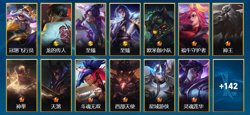 格雷福斯-無情重炮,格雷福斯-禁衛機甲,格雷福斯-泳池派對,格雷福斯-黑暗騎士,卡莎-電玩女神,卡莎-彈幕天使,卡莎-春暉仙子,卡莎-K/DA ALL OUT,德萊文-靈魂收割者,德萊文-金牌主播,德萊文-緋金戰斧,德萊文-德萊德萊,奧莉安娜-光耀之心,奧莉安娜-泳池派對,奧莉安娜-哥特女僕,奧莉安娜-暗星,艾希-黑暗騎士,艾希-女皇,艾希-王牌司令,艾希-極地女神,崔斯特-腥紅之月,崔斯特-王牌艦長,崔斯特-星域遊俠,崔斯特-探戈靈魂,雷克頓-枯萎之壤,雷克頓-鱷霸,雷克頓-泳池派對,艾瑞莉婭-西部天使,艾瑞莉婭-玉劍傳說 舞劍仙,艾瑞莉婭-蓮花之令,李青-神拳,李青-龍的傳人,李青-至高之拳,錘石-腥紅之月,錘石-靈魂蓮華,錘石-未來戰士,厄運小姐-女帝,厄運小姐-西部牛仔,厄運小姐-福牛守護者,阿木木-勁道美味,阿木木-小小騎士,阿木木-驚悚派對,嘉文四世-孤膽英豪,嘉文四世-王牌上將,嘉文四世-福牛守護者,蔚-煉獄魔女,蔚-雙城之戰,蔚-女警官,提莫-熊貓,提莫-兔寶寶,提莫-歐米伽小隊 幽靈特工,劫-源計劃:陰,劫-天煞,劫-衝擊之刃,趙信-龍冕先鋒,趙信-秘密特工,維迦-冰糖葫蘆,維迦-穿著正裝的惡魔,布蘭德-戰場之王,布蘭德-靈魂烈焰,慎-未來戰士,慎-腥紅之月 鬼武者,安妮-福牛守護者,安妮-小紅帽,亞索-西部牛仔,亞索-鬥魂無雙,阿狸-焰尾妖狐,阿狸-偶像歌手,賽娜-夢境靈探,賽娜-西部天使,奧拉夫-王牌勇將,奧拉夫-黑暗騎士,賈克斯-光明騎士,賈克斯-宗師級釣魚訓練師,凱爾-屠龍勇士,凱爾-靈能特工,崔絲塔娜-遊擊隊員,崔絲塔娜-娜就去看看,菲奧娜-緋金麗刃,菲奧娜-福牛守護者,娑娜-五連搖滾鍵盤手,娑娜-電玩女神,阿卡麗-鐵血女忍,阿卡麗-源計劃:暗影,伊澤瑞爾-光執事,伊澤瑞爾-冰川勇者,索拉卡-原始碼,索拉卡-蕉泥座人,伊芙琳-緋金魅影,伊芙琳-探戈靈魂,赫卡裡姆-電玩戰魂,赫卡裡姆-西部魔影,金克絲-光耀之芒,金克絲-清剿小隊,韋魯斯-迅箭,韋魯斯-暗星,凱南-奈落之炎,凱南-刺客信條,娜美-緋金鮫靈,娜美-河水之靈,加里奧-秘旅探索者,加里奧-風執事,古拉加斯-碎桶者,古拉加斯-飛車暴走族,拉莫斯-制勝金球,拉莫斯-熔火之心,內瑟斯-單身貴族,內瑟斯-創世魔神,墨菲特-暗星,墨菲特-無畏號,泰達米爾-惡魔之刃,泰達米爾-光耀之刃,阿利斯塔-福牛守護者,阿利斯塔-哞利斯塔,黛安娜-腥紅之月,黛安娜-暗黑女武神,璐璐-光耀之靈,璐璐-睡衣守護者,薇恩-蒼穹之光,薇恩-獵龍勇士,易-至臻 靈魂蓮華,易-暗影,德萊厄斯-福牛守護者,德萊厄斯-神王,蓋倫-鋼鐵軍團,蓋倫-海上霸主,蕾歐娜-源計劃:山,雷恩加爾-暗黑武士,迦娜-暴風女神,卡爾瑪-光明騎士,永恩-至臻 心之鋼,瑟提-心之鋼,努努和威朗普-喪屍,沃裡克-源計劃:末日,艾克-時之砂,吉格斯-龍冕神策,費德提克-南瓜頭,蒙多醫生-戰爭血統,卡茲克-霸天異形,庫奇-冠翎飛行員,卡特琳娜-死亡誓約,布隆-龍冕御盾,佛耶戈-水晶玫瑰,辛吉德-鍊金狂士,奧瑞利安·索爾-灰燼領主,泰隆-西部魔影 獵天使惡魔,莫甘娜-刀鋒女王,潘森-獵龍勇士,賽恩-戰爭機器,布里茨-蘋果機器人,希瓦娜-秘旅探索者,凱特琳-鐵血狙擊手,卡薩丁-先驅行者,傑斯-光明之錘,卡蜜爾-原始碼