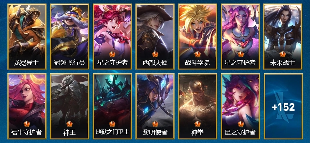 加里奧-神龍守衛,加里奧-秘旅探索者,加里奧-地獄火,加里奧-風執事,加里奧-地獄之門衛士,加里奧-雞里奧,劫-玉劍傳說 無劫,劫-靈能特工,劫-天煞,劫-衝擊之刃,劫-源計劃:陰,希瓦娜-破敗軍團,希瓦娜-秘旅探索者,希瓦娜-銀河魔裝機神,希瓦娜-黯黑魔龍,希瓦娜-冰霜亞龍,艾希-黑暗騎士,艾希-王牌司令,艾希-西部天使,艾希-極地女神,崔斯特-腥紅之月,崔斯特-王牌艦長,崔斯特-探戈靈魂,崔斯特-逍遙賭俠,厄運小姐-女帝,厄運小姐-西部牛仔,厄運小姐-星之守護者,厄運小姐-福牛守護者,薇恩-水晶玫瑰,薇恩-源計劃:淨化,薇恩-蒼穹之光,薇恩-光明哨兵,吉格斯-戰場之王,吉格斯-兔寶寶,吉格斯-科學狂人,吉格斯-泳池派對,亞索-腥紅之月,亞索-西部牛仔,亞索-黑夜使者,亞索-戰場之王,艾瑞莉婭-冰霜之刃,艾瑞莉婭-光明哨兵,艾瑞莉婭-玉劍傳說 舞劍仙,嘉文四世-暗星,嘉文四世-王牌上將,嘉文四世-福牛守護者,德萊文-靈魂收割者,德萊文-緋金戰斧,德萊文-德萊德萊,雷恩加爾-雷喵喵爾,雷恩加爾-霸天戰士,雷恩加爾-暗黑武士,蔚-煉獄魔女,蔚-雙城之戰,蔚-鐵拳執事,傑斯-天啟騎士,傑斯-水晶玫瑰,傑斯-光明之錘,格雷福斯-禁衛機甲,格雷福斯-絕命機甲,格雷福斯-戰鬥教授,金克絲-光耀之芒,金克絲-雙城之戰,金克絲-星之守護者,阿狸-焰尾妖狐,阿狸-星之守護者,阿狸-K/DA ALL OUT,奧拉夫-王牌勇將,奧拉夫-獵龍勇士,奧拉夫-鐵哥們兒,卡茲克-暗星,卡茲克-死亡綻放,卡茲克-霸天異形,菲奧娜-玉劍傳說 無雙,菲奧娜-緋金麗刃,菲奧娜-福牛守護者,趙信-龍冕先鋒,趙信-秘密特工,阿卡麗-銀色之牙,阿卡麗-K/DA ALL OUT,內瑟斯-盜夢者,內瑟斯-單身貴族,雷克頓-枯萎之壤,雷克頓-鱷霸,泰達米爾-惡魔之刃,泰達米爾-光耀之刃,布隆-龍冕御盾,布隆-獵龍勇士,燼-龍冕異士,燼-源計劃:昇華,李青-神拳,李青-地下拳王,奧莉安娜-光耀之心,奧莉安娜-星之守護者,卡莎-星之守護者,卡莎-K/DA ALL OUT,伊澤瑞爾-冰川勇者,伊澤瑞爾-戰鬥學院,霞-暮星之羽,霞-星之守護者 落,安妮-冰霜烈焰,安妮-小紅帽,莫甘娜-玉劍傳說 蒼鸞,莫甘娜-魅惑女巫,蕾歐娜-燒烤女神,蕾歐娜-日蝕騎士,韋魯斯-蒼穹之光,韋魯斯-白色死神,德萊厄斯-福牛守護者,德萊厄斯-神王,娜美-緋金鮫靈,娜美-河水之靈,伊芙琳-緋金魅影,伊芙琳-探戈靈魂,凱特琳-未來戰士,凱特琳-泳池派對,卡蜜爾-星域審判官,卡蜜爾-魔女,菲茲-絨毛,菲茲-銀河魔裝機神,墨菲特-無畏號,墨菲特-冰川巨獸,盧錫安-西部魔影,盧錫安-絕命槍手,布里茨-擂臺皇帝,布里茨-蘋果機器人,提莫-熊貓,提莫-兔寶寶,庫奇-冠翎飛行員,庫奇-電玩上校,崔絲塔娜-歐米伽小隊 魔鬼傘兵,崔絲塔娜-娜就去看看,蓋倫-鋼鐵軍團,迦娜-暴風女神,璐璐-光耀之靈,阿利斯塔-福牛守護者,潘森-未來戰士,銳雯-電玩勇者,易-斬星魔劍,永恩-黎明使者,辛吉德-鍊金狂士,澤麗-海之歌,索拉卡-星域學者,希維爾-腥紅之月,拉莫斯-制勝金球,孫悟空-三昧真火,慎-腥紅之月 鬼武者,凱南-刺客信條,布蘭德-蒼穹之光,黛安娜-暗黑女武神,艾克-時之砂,錘石-盜夢暗影,沃裡克-古神,諾提勒斯-宇航員,賈克斯-武神,圖奇-歐米伽小隊 毒針狙擊手,洛-晨星之翎,努努和威朗普-髒兮兮,莉莉婭-黑夜使者,凱隱-攝魂獵手,凱爾-靈能特工,阿木木-小小騎士,拉克絲-星之守護者,古拉加斯-飛車暴走族,賽娜-夢境靈探