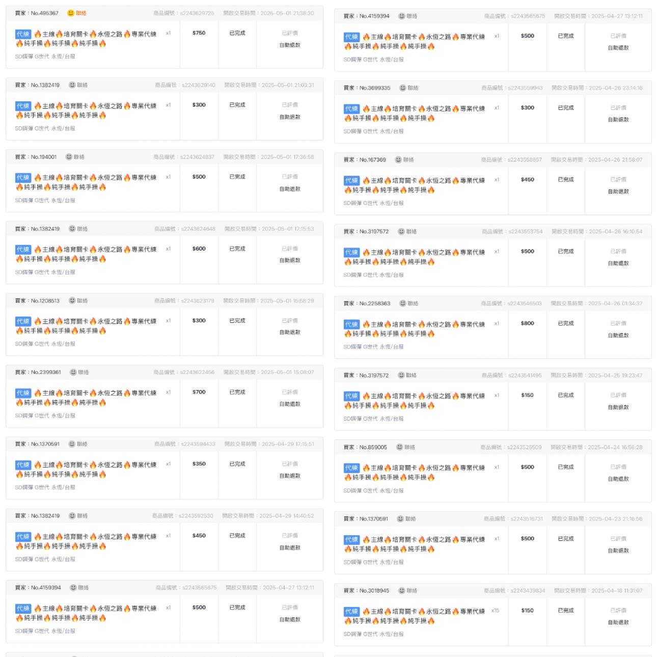 代練流程★下標後,去結帳選繳費方式,付款完回來按【完成付款】★接著去交易進行中商品,點【聯絡賣家】★在裡面的【交易留言板】留下【遊戲帳號資料】,別留錯地方哦!!★然後請把遊戲先關掉,我代練完後,會通知您上線。聯絡方式& 服務時間時間早上6點~晚上11點,全年無休,下標付款後在【聯絡賣家】的【交易留言板】留下【遊戲帳號資料】注代練完成領收後請馬上改密碼>以免發生帳號糾紛★如需其他數量歡迎盡量使用私訊★★每個客戶皆由本人親手代練,資料絕不外洩,手機電腦每三天重灌一次讓你買得安心玩得開心★★每單會盡量在下單付款後的10小時內完成★★免責聲明,代練因其遊戲政策有極低風險被封號,恕不接受任何理由退款、賠償,購買即同意此聲明★★如遇到單子眾多或者麻煩的可能會延遲到出單順序請各位老闆見諒★★如有任何代練上的疑問歡迎請發問★★ 長期客戶有優惠★★代練期間請勿上線,好了會在通知您 ★★ 若帳號中有重要裝備,建議先將重要裝備轉移賣家代練完成後,買家需檢查是否有達到要求,若有問題請及時在留言板上留言並申訴客服說明★★ 免責聲明,如代練後因各項因素導致排行榜無法登載分數,全數損失由買家承擔,購買即同意此聲明★★重要事項,雙方可以交易留言中進行約定,出現交易糾紛時,方便客服中心備查★★ 代練詳細事宜由買賣雙方自行商議,買家要求私下交易,將不受8591保障,賣家要求私下交易,將被停權處罰★★免責聲明,如代練後被系統偵測為外掛導致帳號封鎖等損失情勢,損失責任需由買家全數承擔,購買即同意此聲明★★專業代練手遊,純粹提供代練服務並收取服務費用