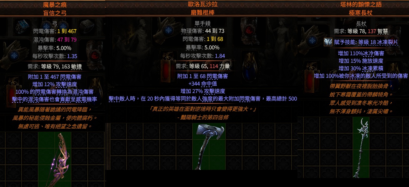 道具 魔暴之痕.盲信之弓混沌感電)歐洛瓦沙拉.磨難棍棒強度)塔林的顫慄之語.極寒長杖