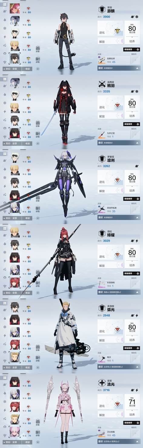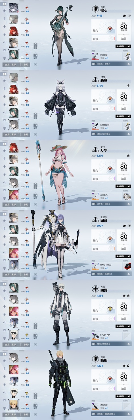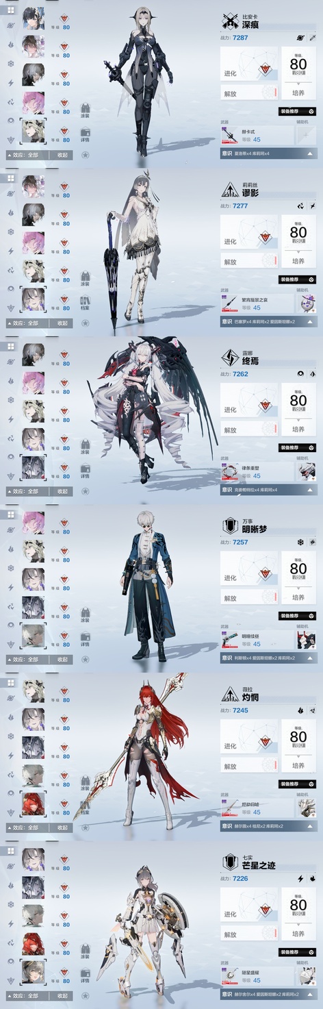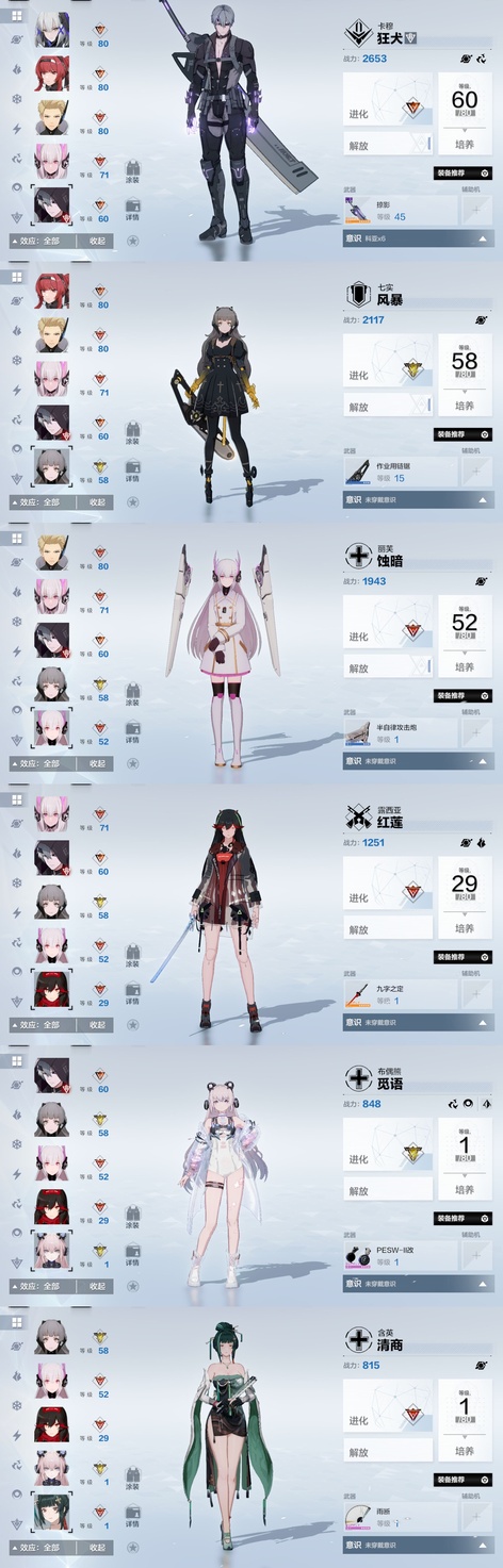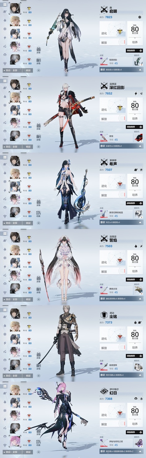 雷隊:3s囚影龍年皮+黑卡皮+專武輔助機,2s七十+專武輔助機,森息+專武 火隊:2s3露西亞+花嫁皮+專武+2s輔助機,2s3渡邊+專武,2s薇拉+專武+輔助機 空隊:2s露娜黑卡皮+專武+輔助機,2s3慈悲者+專武輔助機 冰隊:3s啟明+專武+2s輔助機,2s3萬事+專武,艾拉 物理:2s3賽琳娜+專武輔助機,2s含英加專武輔助機,迴音 暗隊:2s3莉莉絲加專武輔助機 還有一萬多黑黃卡等