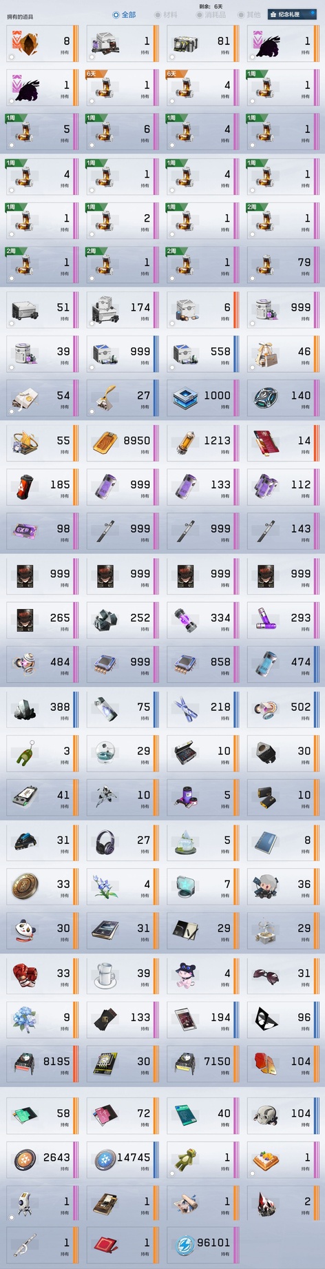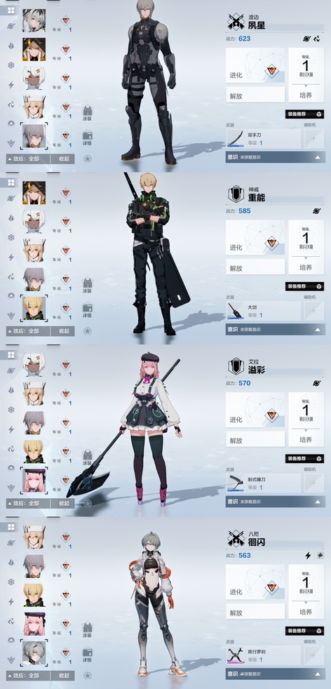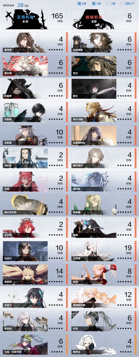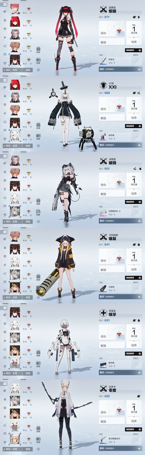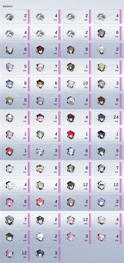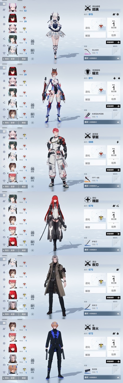雷隊:3s囚影龍年皮+黑卡皮+專武輔助機,2s七十+專武輔助機,森息+專武 火隊:2s3露西亞+花嫁皮+專武+2s輔助機,2s3渡邊+專武,2s薇拉+專武+輔助機 空隊:2s露娜黑卡皮+專武+輔助機,2s3慈悲者+專武輔助機 冰隊:3s啟明+專武+2s輔助機,2s3萬事+專武,艾拉 物理:2s3賽琳娜+專武輔助機,2s含英加專武輔助機,迴音 暗隊:2s3莉莉絲加專武輔助機 還有一萬多黑黃卡等