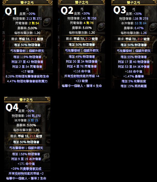道具 【弓、標準、雙子之弓】 %物理傷害 閃電傷害 冰冷傷害 銳眼 亞馬遜 閃電箭Q