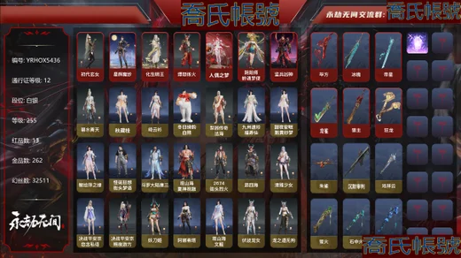 【OBYZJXJ343242】27紅921金|等級669|收藏值540088|墜日|幻絲425069|金磚26|通行證Lv.36 紅色神品:赤皓新囍,初代玄女,朱雀星衣,化生明王,新倩女幽魂·長天藏錦,戎金狼,熛怒煉火,人偶之夢,墨離,泣珠龍紗,監兵凶神,夜魅遊瑩,化道者,流金曉錦,畢方,麒麟魄,少陽劍,冰魄,靈狐幻刃,帝星,龍雀,飛將戟,靈犀,天瓊,錦鯉玉扇,狂龍,鳳求凰 角色金色皮膚:倒反陰陽·熾羽,開闢鴻蒙·山川潤,觀山海·相柳,夜華朝,耀世魂花,玄豹姿,紫金玉女,龍之道·自知,霜天紅葉,雪山天女,碧水青天,九陰聖女,秋藏桂,P5R·奧村春NOIR,云溪仙子,綠野守護·悠竹萌客,綺雲衫,西行劫·紫衣仙子,絮雲衣,冬日綺韻·白熊,九驪之君,武道無窮·少林,若水尊者,梨園傳奇·法海,覺之一念,楓行者,淨金寶相,八寶龍王,裟伽龍王,持威明王,甜夜安眠·鵝黃紗夢,開闢鴻蒙·風雨諧,智繪·萍之緣,蘭庭月,新倩女幽魂·瑤光沐月,新倩女幽魂·流紈裙,怪誕狂想·紅藍狂想,沙暴蒼狼,鑄神·冥天魂使,鬥羅大陸·唐三,噬月天狼,龍之影·龍虎鬥,蒼狼之主,追獵,康復之星,不良人·李星雲,長歌詩韻·鷓鴣天,巫師3·傑洛特,巨闕,逆水寒·染煙,龍心熾焰,夏日派對·椰風夕照,瑞火麟,龍之影·精武魂,孽炎禍鬥,逆水寒·江海滄瀾,立天地,醉山川,遊四海,洛天依·星空投影,巔峰極速·小可,長歌詩韻·遣唐使,輝燁少女,承雲蘭壽,春桃笑,天鈿女命,御宅羅夢,陰陽姬,清雅少女,貴胄少女,狩獵都市·暗夜利刃,決戰平安京·神罰之光,決戰平安京·熱海白珊,陰陽師·赤影妖刀姬,妖刀姬,綠野守護·暗沼摩羅,封神錄·敖丙,阿娜希塔,觀山海·文鰩,巨鯨客,蟄龍吟,掌珠仙子,伏波龍女,怒浪,倒反陰陽·鐵面,開闢鴻蒙·金戈止,鑄神·天淵御水,複製體·尼爾,西行劫·楊戩,百戰·破荊者,弘毅袍,魔傑·撼山嶽,華夏寶甲·漢光,華夏寶甲·秦風,龍之影·過江龍,輝光,守誓者,驍騎,承武·武當,P5R·雨宮蓮JOKER,喜樂祥羽,黃庭道,梨園傳奇·柳生,封神錄·申公豹,武道無窮·太極,司天命,一品仙君,幽篁山鬼,朝聞道,玉衡天君,仙劍奇俠傳·李逍遙,未濟袍,金羽客,金沙·夢蜀,若谷,祿運玉霄,封神錄·龍吉公主,寒煙素,2674·霜凝雪,金襦玉衫,赤丹朱湛,寒英素雪,姑射真人,擊浪,麟鹿大鎧,蒼雷丸,倒反陰陽·凜冬,巔峰極速·蕾雅,千秋匠心·玉葉景,長歌詩韻·胡旋女,觀山海·青鳥,神鷹之女,龍門·飛天,驚雲羽,浣煙紗,金羽聖鷹,蜃樓魅影,璨銀魔梟,瀚海蒼鷹,福瑞天澤,葫蘆兄弟·蛤蟆頭領,街頭狂歡·不敗擂主,觀山海·秋神蓐收,西行劫·悟空,行空裘,冬無歸,干將莫邪,護世四法·持國天王,武道無窮·八極,觀山海·冬神玄冥,春不斂,梨園傳奇·麗娘,封神錄·妲己,日影花陰,武道無窮·形意,黃昏巫主,塔羅序·銜環,卷王,夜綢袍,長歌詩韻·念奴嬌,虹貓藍兔七俠傳·虹貓,封神錄·姜子牙,雲間影,赤焰戰靈,綠野守護·山漠獰影,蝕日之輝,開闢鴻蒙·日月明,雪鈴綺歌,虹貓藍兔七俠傳·藍兔,長歌詩韻·如夢令,狩獵都市·雷行獵手 髮型金色皮膚:縹緲發,簪纓發,落霜發,韶光發,百靈發,綠野守護·嬌憨發,P5R·NOIR髮型發,緣覺發,(挑染)自在發,(挑染)白芷發,(挑染)暮落髮,紫芙發,伏苓發,子菀發,甜夜安眠·暖絨發,蒼狼宗主發,鬥羅大陸·海神發,狼嘯發,逆水寒·江海發,(挑染)熛怒發,巫師3·白狼發,不良人·三聖涅發,月丹發,木棉發,洛天依·洛紀元發,碎浪發,激浪發,浩渺發,安瀾發,鯨海發,(挑染)填海發,綠野守護·冷傲發,(挑染)萬仞山發,雲長冠發,倒反陰陽·銘誓發,鑄神·玄鱗發,立靖仇驗發,(挑染)羽客發,九梁發,竹律發,P5R·JOKER髮型發,承武·剛柔發,逍遙發,冰凌發,(挑染)代號·冷萃發,封神錄·紅鸞星發,排霜發,閻摩發,(挑染)凜威發,(挑染)鳳姿發,夕鷹發,觀山海·青鸞發,千秋匠心·琳琅發,觀山海·天刑發,(挑染)戾君發,(挑染)宵燭發,觀山海·冥泉發,(挑染)霧灼發,繾綣發,幽焰發,流螢發,鶴髮,古溪發,護世四法·淨天發,封神錄·籠煙芍藥發,(挑染)商月發,驚雀發,秀逸發,(挑染)獅鬃發,長歌詩韻·豪傑發,封神錄·仙風發,(挑染)逐影發,鶴姿發,蜜語發,長歌詩韻·沉醉發,虹貓藍兔七俠傳·藍髮,斬神·熾羽塵光發,狩獵都市·迅猛發 武器金色皮膚:驚火弦,御氣弩,咕咕,天牛翼,千機弩,鎮海,狂嘯,朱雀,青鳥,冬日序曲·雪野巡禮,沉默審判,戲祥雲,綠野守護·雨幕,引冰落,金蠍,玉飛梭,螢火,獵獁銃,出淵蛟,石中火,天心玉,狩獵都市·潛磷,雪國禮炮,兔華籠,鑽山,觀山海·嘉果花,造景,墨雙戟-不歸,火羅衛,竹霹靂,吞海鮫,玄武,龍息,龍嘯,丹鶴,凝冰魄,虎踞,迎宵,爐中火,星追月,心魔,月虹弦角,烏木弓,枯影,誅神,豹胎易筋弓,逆逢,轉輪弓,風馳弓,青花,春水,日輝,狻猊吼,陰陽師·雅矢,蓮心劍雨,炎魔,朧月魂,不良人·華陽針,玄銅飛軍,翠影,醒獅,綠野守護·毛乎乎,熾意炎拳,天狐,2674·原型,不良人·龍泉劍,虹貓藍兔七俠傳·長虹劍,虹貓藍兔七俠傳·冰魄劍,財神劍,巫師3·湖女之劍,玉霜龍,亢龍,隱鋒,監星尺,赤霄,降龍木,鎮魔尺,福祿雙至,華夏神兵·永樂寶劍,壺中日月,含光承影,陰陽師·傘劍,醉花風,切影,殘陽,毅魂守,黑繩,金玉一文字,劫燼·燎,櫻華,雷賜,數珠丸,陰陽師·鬼切,倒反陰陽·盡春鋒,白鹿,燭淚,無韻,斬銀河,劫燼·鍛,青石猊,破天,龍蟠,山君怒,決戰平安京·神罰之刃,決戰平安京·珊海之刃,惡障,陰陽師·落櫻之刃,闊刀-陰陽師·赤影妖刀,斬神·前方禁行,星輝環月,千鈞羽,麒麟牙,劫濤·潮,護雲狩,鎮山河,仙彩,靈木角,觀山海·金神鉞,焦鈺,長虹,雪夜·清
