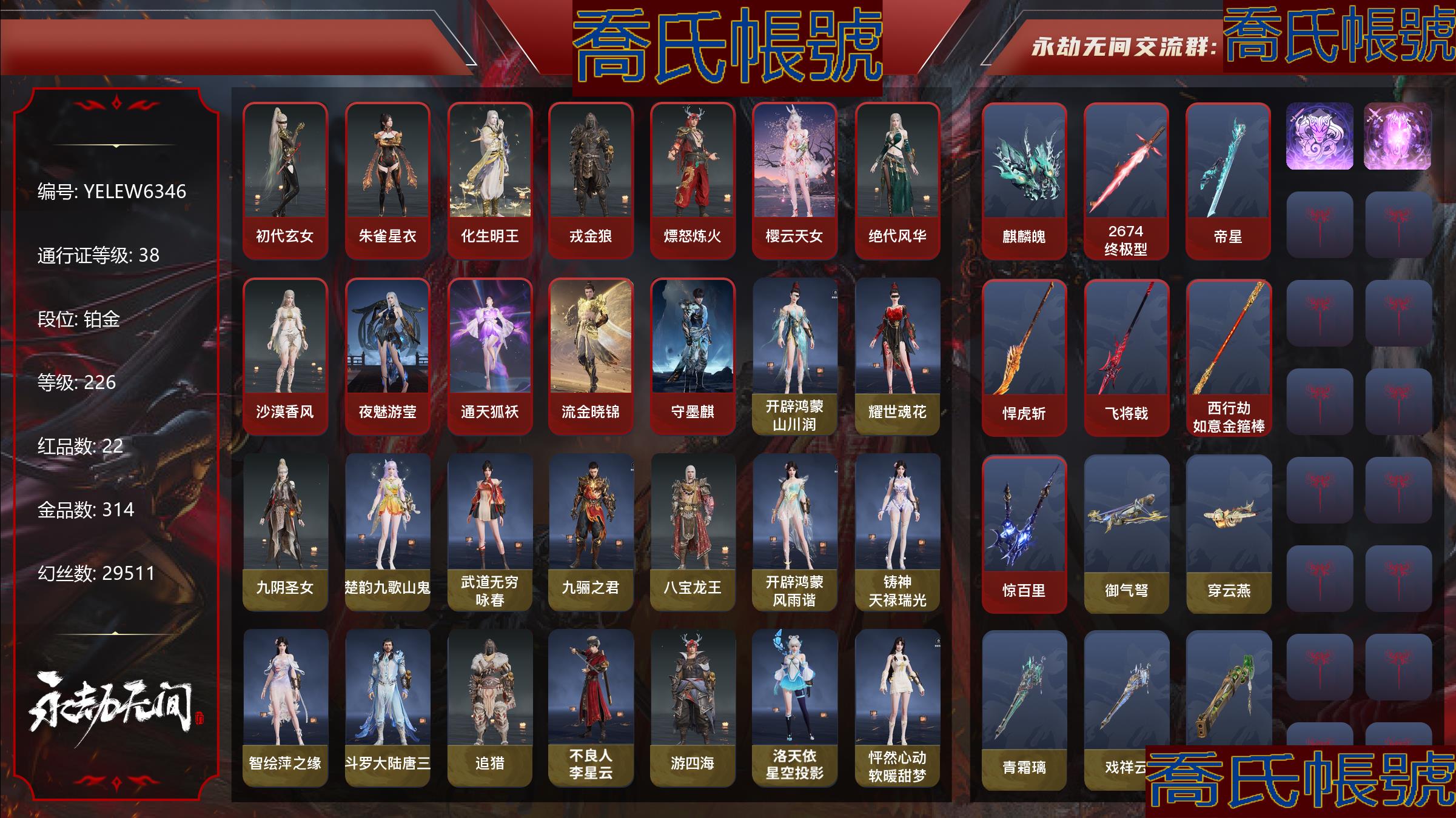 【OBYELEW634642】22紅314金|等級226|鉑金|幻絲29511|金磚559|通行證Lv.38 紅色神品:初代玄女,朱雀星衣,化生明王,戎金狼,熛怒煉火,櫻雲天女,絕代風華,沙漠香風,夜魅遊瑩,通天狐襖,流金曉錦,守墨麒,麒麟魄,2674·終極型,帝星,悍虎斬,飛將戟,西行劫·如意金箍棒,驚百里,初櫻綺夢發 角色金色皮膚:開闢鴻蒙·山川潤,耀世魂花,九陰聖女,楚韻九歌·山鬼,武道無窮·詠春,九驪之君,八寶龍王,開闢鴻蒙·風雨諧,鑄神·天祿瑞光,智繪·萍之緣,鬥羅大陸·唐三,追獵,不良人·李星雲,遊四海,洛天依·星空投影,怦然心動·軟暖甜夢,春日序曲·晨風,夏日派對·高校水著,御宅羅夢,清雅少女,貴胄少女,狩獵都市·暗夜利刃,妖刀姬,封神錄·敖丙,阿娜希塔,楚韻九歌·湘夫人,觀山海·文鰩,赤霧煙霞,伏波龍女,怒浪,開闢鴻蒙·金戈止,西行劫·楊戩,弘毅袍,龍之影·過江龍,梨園傳奇·柳生,封神錄·申公豹,祿運玉霄,封神錄·龍吉公主,花之傾奇,浣煙紗,璨銀魔梟,瀚海蒼鷹,福瑞天澤,葫蘆兄弟·蛤蟆頭領,觀山海·秋神蓐收,西行劫·悟空,封神錄·哪吒,觀山海·冬神玄冥,封神錄·妲己,春日序曲·赤羽,楚韻九歌·雲中君,赤誠心,封神錄·姜子牙,雲間影,雪鈴綺歌,狩獵都市·雷行獵手 髮型金色皮膚:燦蓮花發,鬥羅大陸·海神發,逆水寒·江海發,(挑染)騰煙發,(挑染)騰煙發,(挑染)櫻舞發,木棉發,怦然心動·戀歌發,(挑染)填海發,封神錄·紅鸞星發,排霜發,翔鸞發,觀山海·天刑發,(挑染)桀驁發,(挑染)宵燭發,流螢發,春日序曲·玄瑛發,封神錄·籠煙芍藥發,秀逸發,封神錄·仙風發,(挑染)風吹雪發,(挑染)逐影發,蜜語發,(挑染)牽雲霞發,狩獵都市·迅猛發 武器金色皮膚:御氣弩,穿雲燕,青霜璃,戲祥雲,螢火,雪國禮炮,兔華籠,雷落,丹鶴,凝冰魄,虎踞,迎宵,鸚鵡螺,月虹弦角,烏木弓,日輝,暝蛇引,蓮心劍雨,炎魔,天狐,虹貓藍兔七俠傳·冰魄劍,財神劍,亢龍,西行劫·紫金寶劍,壺中日月,含光承影,醉花風,拂雪絨,毅魂守,陰陽師·鬼切,雷厲,盜墓筆記·黑金古刀,斬銀河,青石猊,龍蟠,惡障,麒麟牙,劫濤·潮,觀山海·朱明,西行劫·三尖兩刃刀,靈木角,觀山海·金神鉞,劫垢·堀,長虹,建木,委蛇矛,白虹,糖果棍,冰輝,2674·貳型電漿杖,判官筆,仙舞,華夏神兵·馬首刀,青峰疊扇,騰雲歌,耀夜流華,葉底花,嘶風,鎮魔杵,精武,詭月·鏈魂,蛋仔派對·鹹魚,禍忌,破重雲 飾品金色皮膚:染紅紗,崑崙龍神冠,美團·團上頭了,觀山海·腓尾,甲辰龍,福虎帽,靈狐耳,陰陽靈狐,劫妹飛船,冰鏈,暗香,安歌帽,鮫人角,銀雪,虎絨耳,葫蘆兄弟·蛤蟆頭,觀山海·秋金,觀山海·冬稜,封神錄·傾城,夢棠,虹貓藍兔七俠傳·虹光,安樂冠,金瑛冠,虹貓藍兔七俠傳·赤龍,夜露帽,盜墓筆記·防風帽,鹿鈴角,虹貓藍兔七俠傳·寒月,虹貓藍兔七俠傳·雪團,狩獵都市·碎空龍尾 變身器:神烏造像,鎧甲勇士·帝皇俠,荊魂,西行劫·神君印,封神錄·赤蓮,攬九天 【代幣或期限道具請以實際驗號為準】【Steam】【國服】