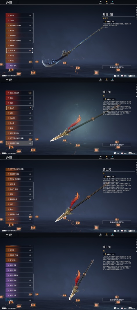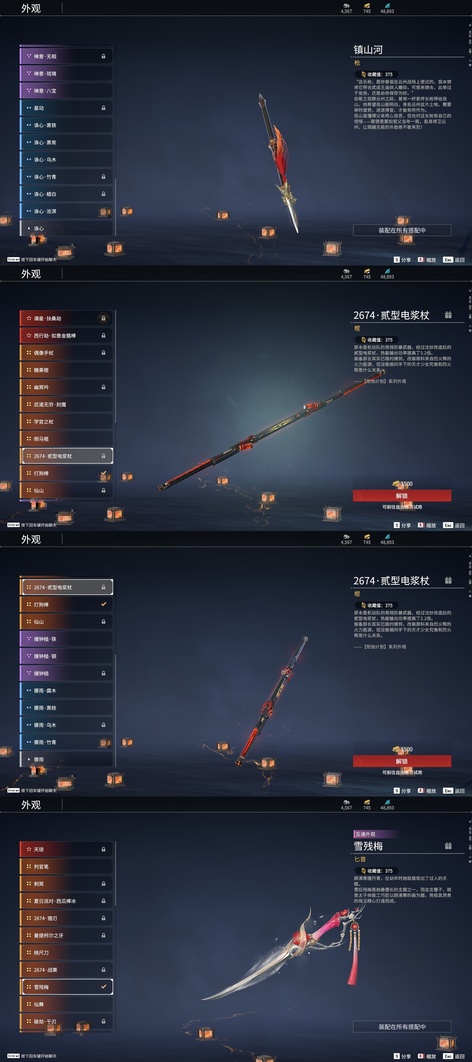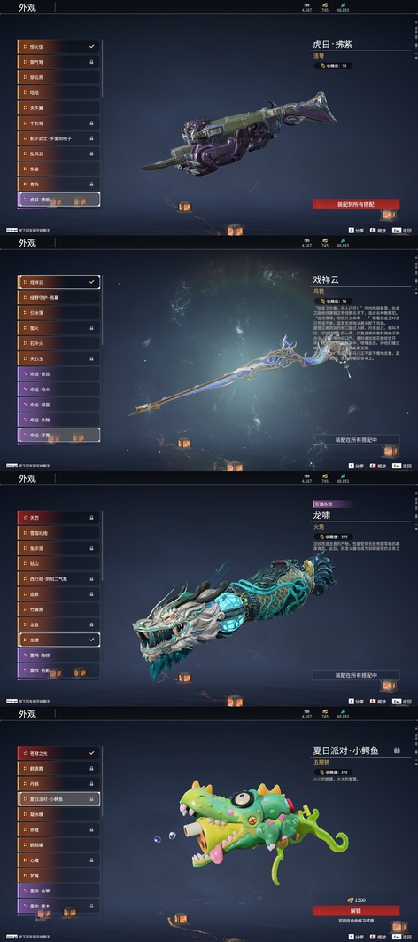少陽劍,壺中日月,含光承影,劫燼·煉,西行劫·紫金寶劍,隱鋒,監星尺,陰陽師·雅矢,逆逢,轉輪弓,數珠丸,陰陽師·鬼切,碎星河,黑繩,狼主,聽濤,惡障,長虹,建木,劫垢·堀,華夏神兵·馬首刀,仙舞,雪殘梅,橈尺刀,狂龍,精武,鎮魔杵,嘶風,月瞳,夔牛槌,新月,破重雲,美食家,武道無窮·雙蝶,打狗棒,倒馬棍,學宮之杖,武道無窮·封魔,神龍刀,飛將戟,護雲狩,劫濤·潮,護世四法·螭龍,逆晦朔,鐵羽,葉底花,千堆雪,無韻,燭淚,朱雀,石中火,龍嘯,竹霹靂,夢魘,鸚鵡螺,炎魔,蓮心劍雨,引冰落,破天,天牛翼,豹胎易筋弓,逍遙,鬥羅大陸·海神三叉戟,咕咕,咯咯,怨憎,2674·原型,天狐,凝冰魄,亢龍,青石猊,麒麟牙,耀夜流華,鑽山,瞑視,盜墓筆記·黑金古刀,蛋仔派對·鹹魚,藤魂,古墓麗影·登山鎬,隱天淵,綠野守護·雨幕,烏木弓,綠野守護·毛乎乎,白鹿,靈木角,空寒,斬怨,蒼雷破,巫師3·湖女之劍,邪尾,戲祥雲,雪國禮炮,蒼穹之光,糖果棍,判官筆,鎏金勺,拳皇·舞扇,騰雲歌,穿雲燕,毅魂守,光影裁決,詭月,驚火弦,鎮山河,翠影
