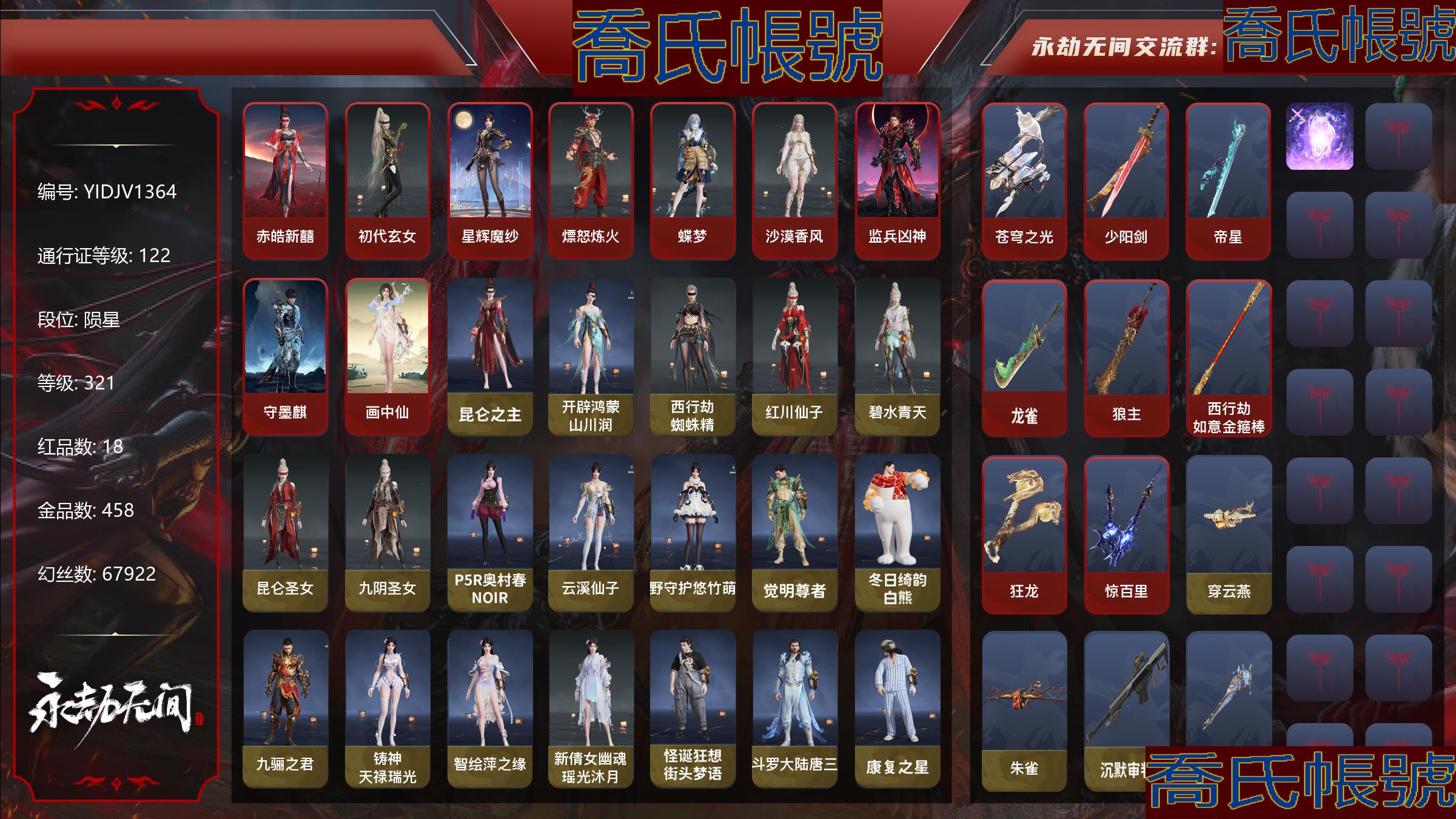 【OBYIDJV136442】18紅458金|等級321|隕星|幻絲67922|金磚2|通行證Lv.122 紅色神品:赤皓新囍,初代玄女,星輝魔紗,熛怒煉火,蝶夢,沙漠香風,監兵凶神,守墨麒,畫中仙,蒼穹之光,少陽劍,帝星,龍雀,狼主,西行劫·如意金箍棒,狂龍,驚百里 角色金色皮膚:崑崙之主,開闢鴻蒙·山川潤,西行劫·蜘蛛精,紅川仙子,碧水青天,崑崙聖女,九陰聖女,P5R·奧村春NOIR,云溪仙子,綠野守護·悠竹萌客,覺明尊者,冬日綺韻·白熊,九驪之君,鑄神·天祿瑞光,智繪·萍之緣,新倩女幽魂·瑤光沐月,怪誕狂想·街頭夢語,鬥羅大陸·唐三,康復之星,不良人·李星雲,巫師3·傑洛特,龍之影·精武魂,逆水寒·江海滄瀾,遊四海,狩獵都市·紫藤神子,洛天依·星空投影,春日序曲·晨風,龍之道·至純,清雅少女,狩獵都市·暗夜利刃,決戰平安京·戀念私語,妖刀姬,庖丁·餚嬋,綠野守護·暗沼摩羅,觀山海·精衛,煦陽漫敘,鑄神·天淵御水,2674·爭鬥洪流,複製體·尼爾,新魔傑·斬魔天將,常勝袍,華夏寶甲·漢光,龍之影·過江龍,黃庭道,一品仙君,若谷,春日序曲·寒芷,祿運玉霄,封神錄·龍吉公主,畲族·鳳凰裝,倒反陰陽·凜冬,福瑞天澤,街頭狂歡·不敗擂主,西行劫·悟空,怦然心動·音律織光,夏日派對·盛夏白陽,春不斂,梨園傳奇·麗娘,封神錄·妲己,春日序曲·赤羽,卷王,怦然心動·熱力節拍,封神錄·姜子牙,雲間影,綠野守護·山漠獰影,古冢行,夏日派對·極光夏夜,開闢鴻蒙·日月明,雪鈴綺歌,龍之道·靈心,狩獵都市·雷行獵手 髮型金色皮膚:落霜發,綠野守護·嬌憨發,(挑染)千絲發,P5R·NOIR髮型發,伏苓發,(挑染)暮落髮,鬥羅大陸·海神發,逆水寒·江海發,巫師3·白狼發,不良人·三聖涅發,(挑染)水仙發,銀杏發,洛天依·洛紀元發,狩獵都市·歸寧發,(挑染)填海發,綠野守護·冷傲發,皰丁·沸涓發,(挑染)冰羽發,封神錄·紅鸞星發,排霜發,(挑染)鳳姿發,幽焰發,(挑染)宵燭發,封神錄·籠煙芍藥發,驚雀發,秀逸發,封神錄·仙風發,鶴姿發,蜜語發,曉夢發,狩獵都市·迅猛發 武器金色皮膚:穿雲燕,朱雀,沉默審判,戲祥雲,綠野守護·雨幕,螢火,天心玉,狩獵都市·潛磷,雪國禮炮,兔華籠,造景,竹霹靂,龍嘯,狩獵都市·脈衝銀顎,丹鶴,凝冰魄,赤霞,鸚鵡螺,心魔,月淬霜,烏木弓,陰陽師·雅矢,蓮心劍雨,炎魔,朧月魂,不良人·華陽針,詭刃八岐,蒼雷破,綠野守護·毛乎乎,天狐,2674·超越型,道詭異仙·七星銅錢劍,不良人·龍泉劍,財神劍,巫師3·湖女之劍,亢龍,華夏神兵·永樂寶劍,壺中日月,醉花風,毅魂守,鎏金勺,邪尾,劫燼·燎,數珠丸,天狼遺鋒,白鹿,斬銀河,劫燼·鍛,魚化龍,聽濤,闊刀-陰陽師·赤影妖刀,璃光·星輝環月,斷月影,麒麟牙,劫濤·潮,仙彩,靈木角,藤魂,劫垢·堀,長虹,建木,委蛇矛,輸液架,糖果棍,倒馬棍,打狗棒,聖山瞳刃,判官筆,仙舞,華夏神兵·馬首刀,青峰疊扇,墨絨羽扇,拳皇·舞扇,騰雲歌,耀夜流華,優曇華,咯咯,嘶風,鎮魔杵,破劫·飛金,九霄寒,精武,詭月·鏈魂,日凝焰,朧夜狐影,空寒,古墓麗影·登山鎬,無救,破重雲,赤影玄印,光影裁決,隱天淵,銜月 飾品金色皮膚:玄陶俑面·女,目瞪馬呆·女,染紅紗,魂花耀,美團·團上頭了,植物大戰殭屍2·腦子給我,P5R·NOIR的帽子,綠野守護·絨絨貓,觀山海·腓尾,冬日綺韻·熊熊頭,玄陶俑面·男,目瞪馬呆·男,瓦貓,巫師3·驢耳朵,福虎帽,洛天依·資料耳機,浮元子,陰陽靈狐,匣中女郎,飛鼠,鮫人角,雪鹿雌角,凱旋盔,道詭異仙·惘心笠,銀雪,虎絨耳,觀山海·冬稜,傾國傾城·名花,纖蝶絨輕,封神錄·傾城,繃帶頭套,虹貓藍兔七俠傳·虹光,安樂冠,金瑛冠,夜露帽,盜墓筆記·防風帽,鹿鈴角,羽之華,虹貓藍兔七俠傳·寒月,狩獵都市·碎空龍尾,驟雷鏢旗 變身器:2674·初代機,珥冰,彩俑娃娃,剪紙·彩刀,金人俑,荊魂,應龍號,西行劫·神君印,千秋匠心·兇虎,攬九天,百戰·枷鎖 【代幣或期限道具請以實際驗號為準】【Steam】【國服】