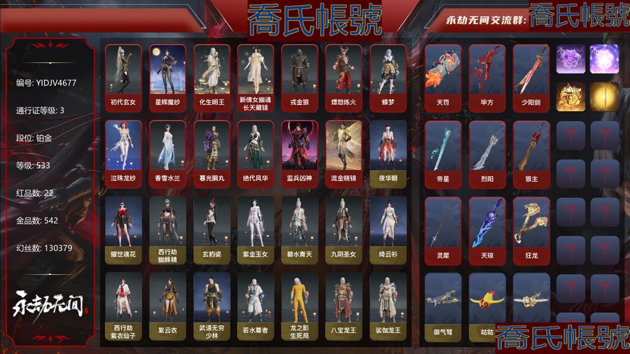 【OBYIDJV467742】22紅542金|等級533|鉑金|幻絲130379|金磚0|通行證Lv.3 紅色神品:初代玄女,星輝魔紗,化生明王,新倩女幽魂·長天藏錦,戎金狼,熛怒煉火,蝶夢,泣珠龍紗,香雪水蘭,暮光胴丸,絕代風華,監兵凶神,流金曉錦,天罰,畢方,少陽劍,帝星,烈陽,狼主,靈犀,天瓊,狂龍 角色金色皮膚:夜華朝,耀世魂花,西行劫·蜘蛛精,玄豹姿,紫金玉女,碧水青天,九陰聖女,綺雲衫,西行劫·紫衣仙子,絮雲衣,武道無窮·少林,若水尊者,龍之影·生死局,八寶龍王,裟伽龍王,智繪·萍之緣,沐昭,新倩女幽魂·瑤光沐月,新倩女幽魂·流紈裙,鬥羅大陸·唐三,噬月天狼,巫師3·傑洛特,巨闕,2674·街頭烈火,龍心熾焰,龍之影·精武魂,逆水寒·江海滄瀾,輝燁少女,御宅羅夢,清雅少女,貴胄少女,妖刀姬,阿娜希塔,楚韻九歌·湘夫人,巨鯨客,掌珠仙子,開闢鴻蒙·金戈止,複製體·尼爾,西行劫·楊戩,常勝袍,百戰·破荊者,華夏寶甲·漢光,龍之影·過江龍,守誓者,梨園傳奇·柳生,封神錄·申公豹,司天命,幽篁山鬼,朝聞道,金羽客,封神錄·龍吉公主,藏雨閣主,寒英素雪,禍津素盞,麟鹿大鎧,花之傾奇,蒼雷丸,千秋匠心·玉葉景,觀山海·青鳥,神鷹之女,龍門·飛天,驚雲羽,瀚海蒼鷹,葫蘆兄弟·蛤蟆頭領,街頭狂歡·不敗擂主,觀山海·秋神蓐收,行空裘,斑斕衣,干將莫邪,護世四法·持國天王,觀山海·冬神玄冥,封神錄·妲己,黃昏巫主,天工奧妙,夜綢袍,金財聚輝,封神錄·姜子牙,暖冬茶馨 髮型金色皮膚:簪纓發,韶光發,百靈發,緣覺發,蘇木發,紫芙發,伏苓發,子菀發,蒼狼宗主發,鬥羅大陸·海神發,(挑染)騰煙發,逆水寒·江海發,巫師3·白狼發,(挑染)水仙發,月丹發,月下香發,(挑染)櫻舞發,安瀾發,鯨海發,碎浪發,(挑染)萬仞山發,(挑染)清威發,九梁發,竹律發,冰凌發,封神錄·紅鸞星發,閻摩發,翔鸞發,夕鷹發,觀山海·青鸞發,千秋匠心·琳琅發,觀山海·天刑發,流螢發,繾綣發,觀山海·冥泉發,古溪發,封神錄·籠煙芍藥發,驚雀發,封神錄·仙風發 武器金色皮膚:御氣弩,咕咕,天牛翼,千機弩,鎮海,雨歇,狂嘯,亂風雲,戲祥雲,引冰落,金蠍,玉飛梭,天心玉,兔華籠,鑽山,觀山海·嘉果花,墨雙戟-不歸,火羅衛,竹霹靂,貔貅吞寶,龍息,龍嘯,丹鶴,凝冰魄,虎踞,迎宵,鸚鵡螺,爐中火,星追月,心魔,夢魘,烏木弓,豹胎易筋弓,逆逢,轉輪弓,風馳弓,青花,春水,日輝,腥紅之月,暝蛇引,陰陽師·雅矢,炎魔,不良人·華陽針,天狐,2674·原型,財神劍,琴心,亢龍,隱鋒,監星尺,俠骨·清光引,劫燼·煉,赤霄,降龍木,鎮魔尺,福祿雙至,壺中日月,陰陽師·傘劍,金玉一文字,劫燼·燎,櫻華,念珠丸,燭淚,無韻,青石猊,破天,龍蟠,山君怒,雷王鋸,暮影,陰陽師·妖刀,麒麟牙,觀山海·朱明,靈木角,藤魂,鬥羅大陸·海神三叉戟,觀山海·金神鉞,劫垢·堀,焦鈺,長虹,雪夜·清光引,建木,凌雲志,玄鯨骨叉,擊蒼穹,白虹,寶月琉璃,冰輝,武道無窮·封魔,學宮之杖,倒馬棍,戒律杖,曼提柯爾之牙,橈尺刀,三更令,雪殘梅,仙舞,鶴唳,化魄,華夏神兵·馬首刀,青峰疊扇,耀夜流華,千堆雪,逍遙,咯咯,夔牛槌,傲骨,月瞳,嘶風,除歲,法持,銜谷,鎮魔杵,九霄寒,降魔手,地火湧,精武,怨憎,無救,天威,禍忌,天之刑,絕潮汐,破重雲,必安,隱天淵,銜月,觀山海·水衡 飾品金色皮膚:真的抱歉,白菜頭,自動人形·埃米爾,劫杯·戰神,雁落笠,染紅紗,一品紅,暖冬帽·女,美團·團上頭了,植物大戰殭屍2·腦子給我,粽香遠,系雲瀾,炎流雲禪笠,暖冬帽·男,魔燭帽,靈蘭,天狼盔,虎頭帽,巫師3·驢耳朵,甲辰龍,瑞獅頭,雪鹿雄角,醒獅頭,福虎帽,浮元子,立烏帽,毒刺,鐵護臂,暗香,安歌帽,鮫人角,雪鹿雌角,凱旋盔,百戰·斬棘盔,約誓盔,青龍盔,雲鶴冠,銀雪,癸卯兔,雪笠,瓊花帽,雪絨帽,葫蘆兄弟·蛤蟆頭,街頭狂歡·制勝之道,觀山海·秋金,觀山海·冬稜,晝隱,無崇,封神錄·傾城,醉狐銀,夢棠,季中賽2025·瀚沙,玄天冠,金瑛冠,清虛面,盜墓筆記·防風帽,晝百合 【代幣或期限道具請以實際驗號為準】【Steam】【國服】