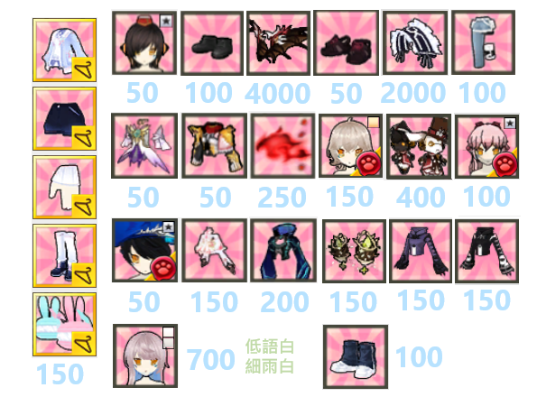 我出衣架: 髮上下+81、手鞋+42、武器飾品+111、連身+156