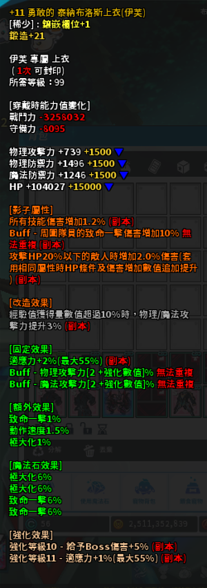 +11 鍛21 泰納布洛斯 上衣 EVE 給綁(隊員的致命一擊傷害增加10%)