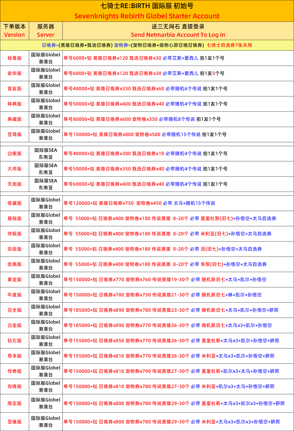 全 8591 首家 七騎士重生製版RE:BIRTH韓服國際服開局初始自抽自選初始首抽號