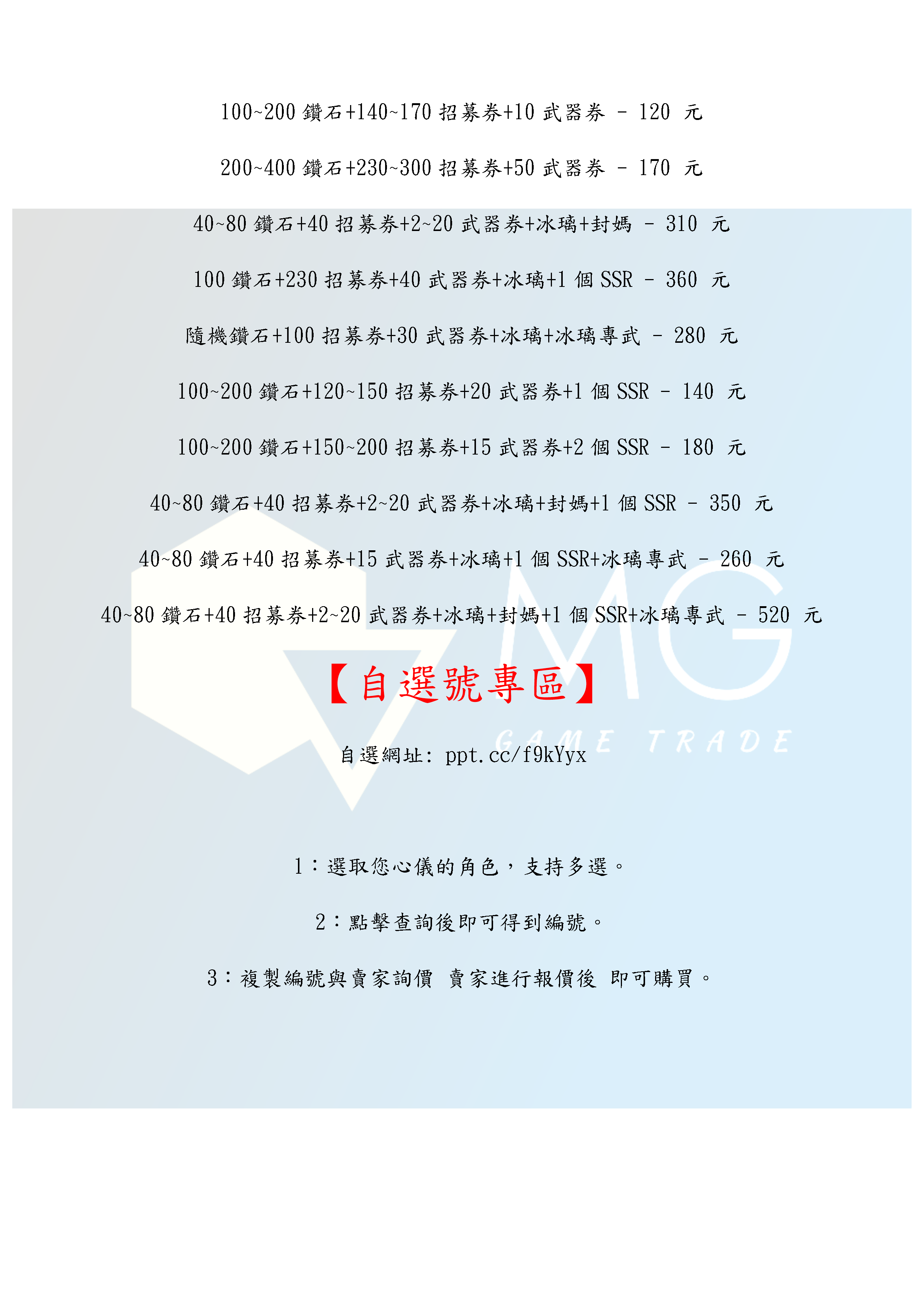 帳號 【初始號】 【MG數碼】 日服 韓服 多石號 多鑽石號 初始號 自抽號 自選號 自選組合
