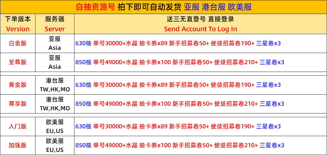 普通版 TW,HK服 2200水晶葉+使徒招募券X106+新手招募券X50+抽卡券X30+自選三星券X1