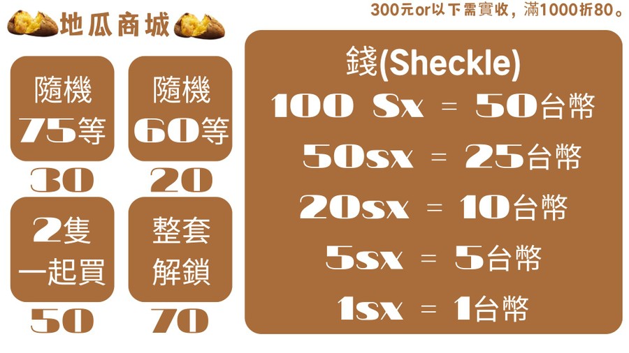 | 🪿🪙金鵝:20台幣 | 🦖🦴脊背龍 :70台幣 |