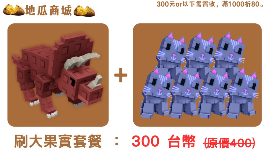 | 🪴刷大果實套餐(1+三角龍+7隻月貓) | 300台幣 |