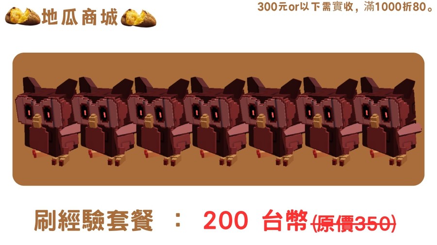 | 🌐刷經驗套餐(7隻貓頭鷹) | 200台幣 |