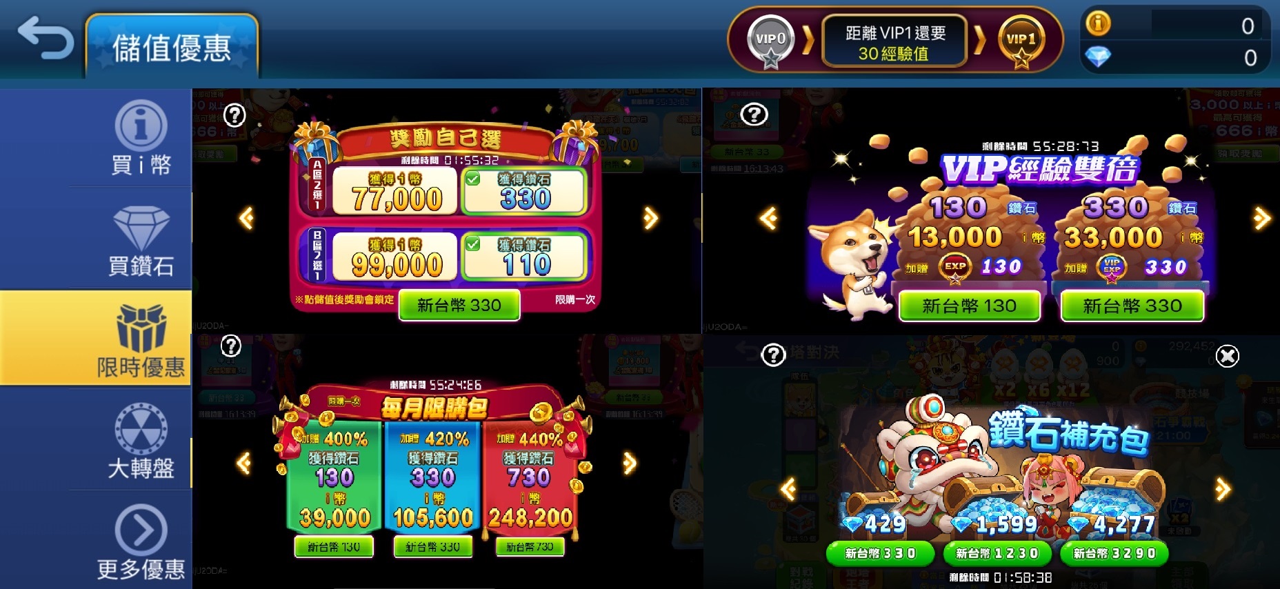 禮包類型:純幣(不建議購買)、純鑽(大約1.2~1.4倍加碼)、鑽+幣包(鑽+幣400%)、經驗禮包