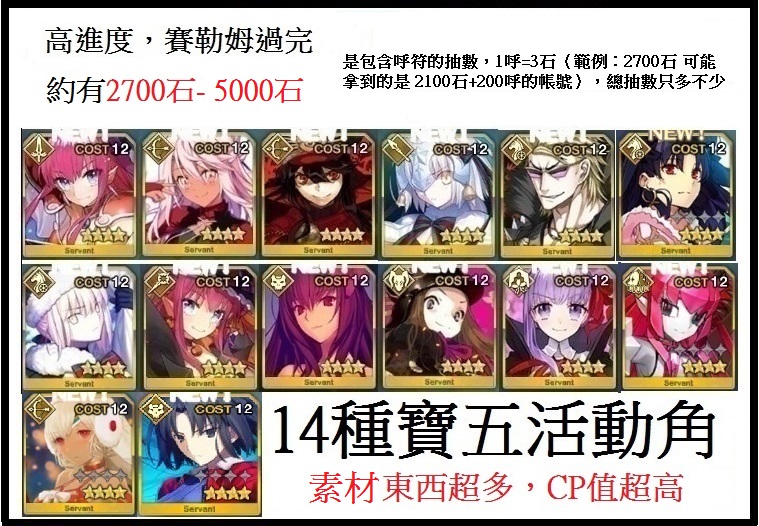 14種寶5活動4星角:術龍娘+騎金時+殺師匠+小黑+劍龍娘+聖誕黑傻+聖誕幼貞+信長+茶茶+BB+騎凜+機龍娘+弓提拉+殺兩儀式