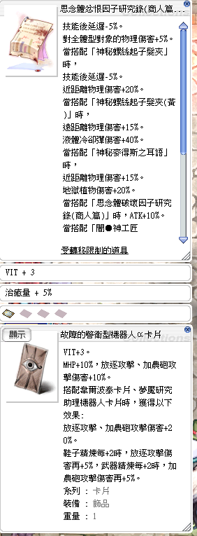 道具 🍎思念體忿恨因子研究錄(商人篇) 【故障的警衛型機器人卡】 VIT+3/治癒5%