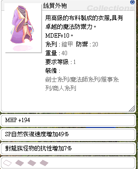 道具 絲質外袍 MHP+194 SP恢復+49% 龍抗+7%