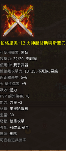武器:+12祝福火神雙刀 +14亞瓦隆雙刀
