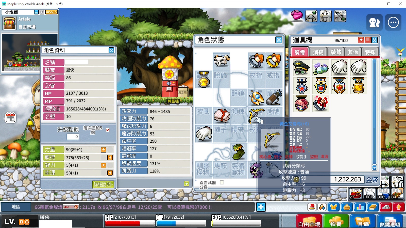 帳號 【86等、遊俠_箭神】 艾倫弓+6 攻表1485 有寵物123 有造型券 100萬 不議價