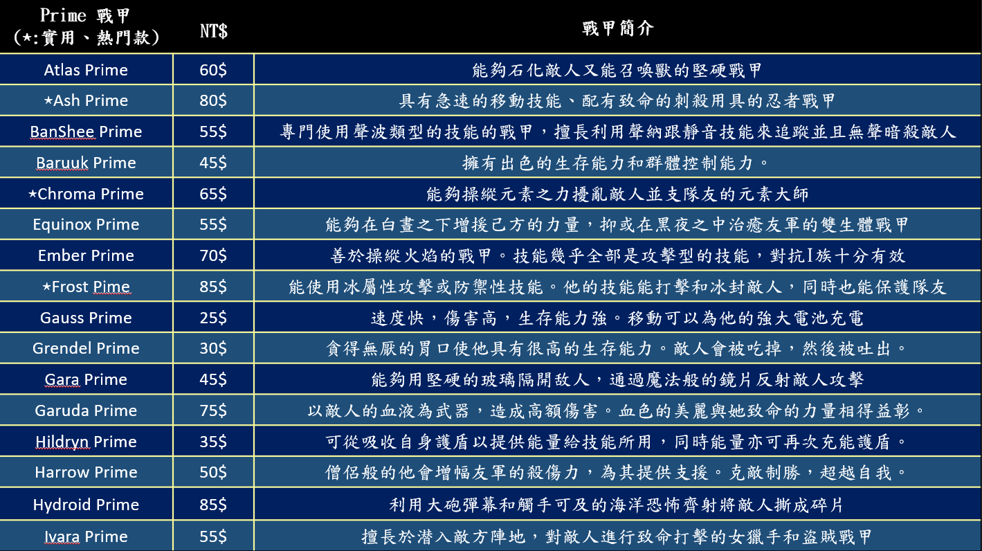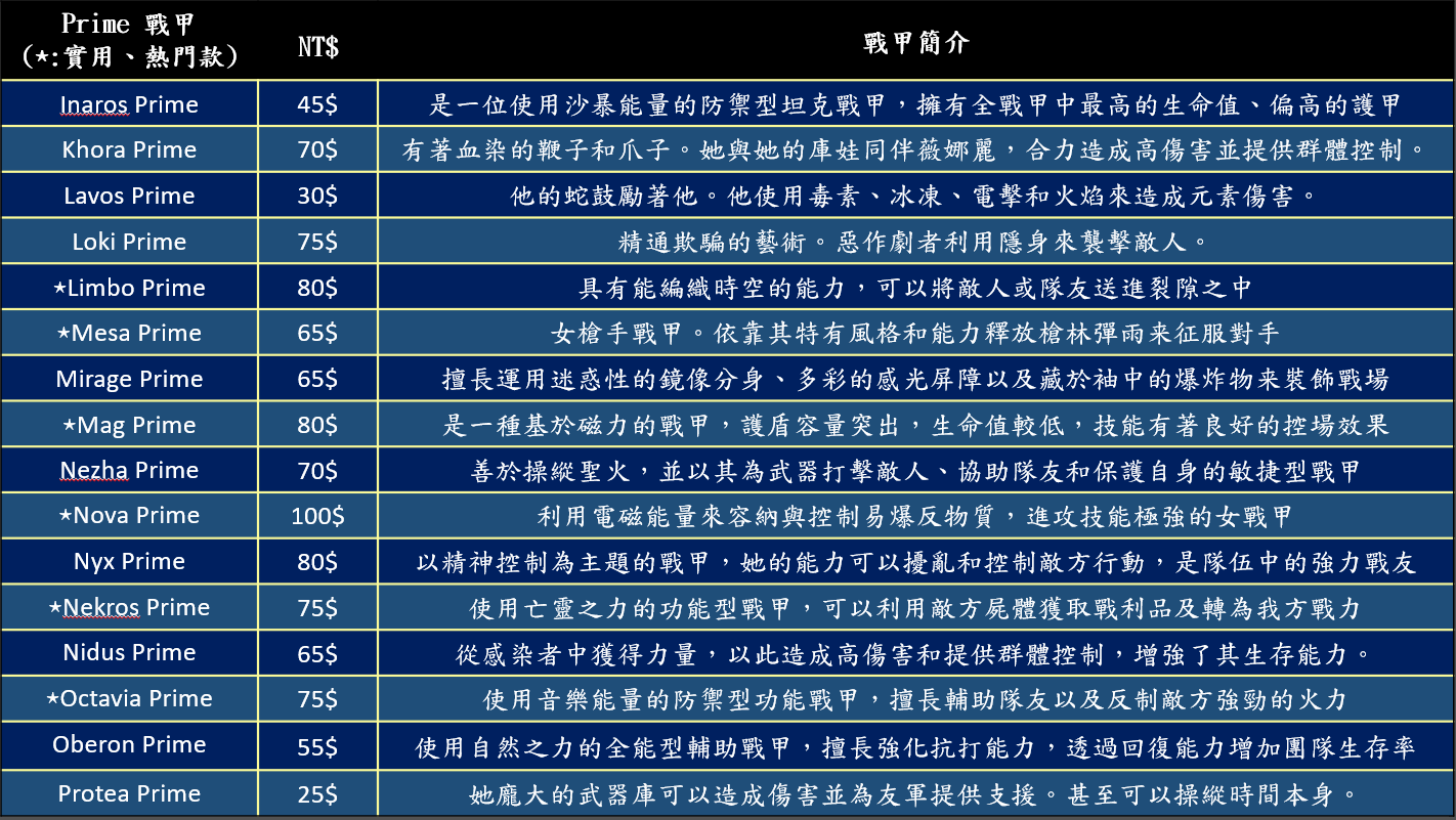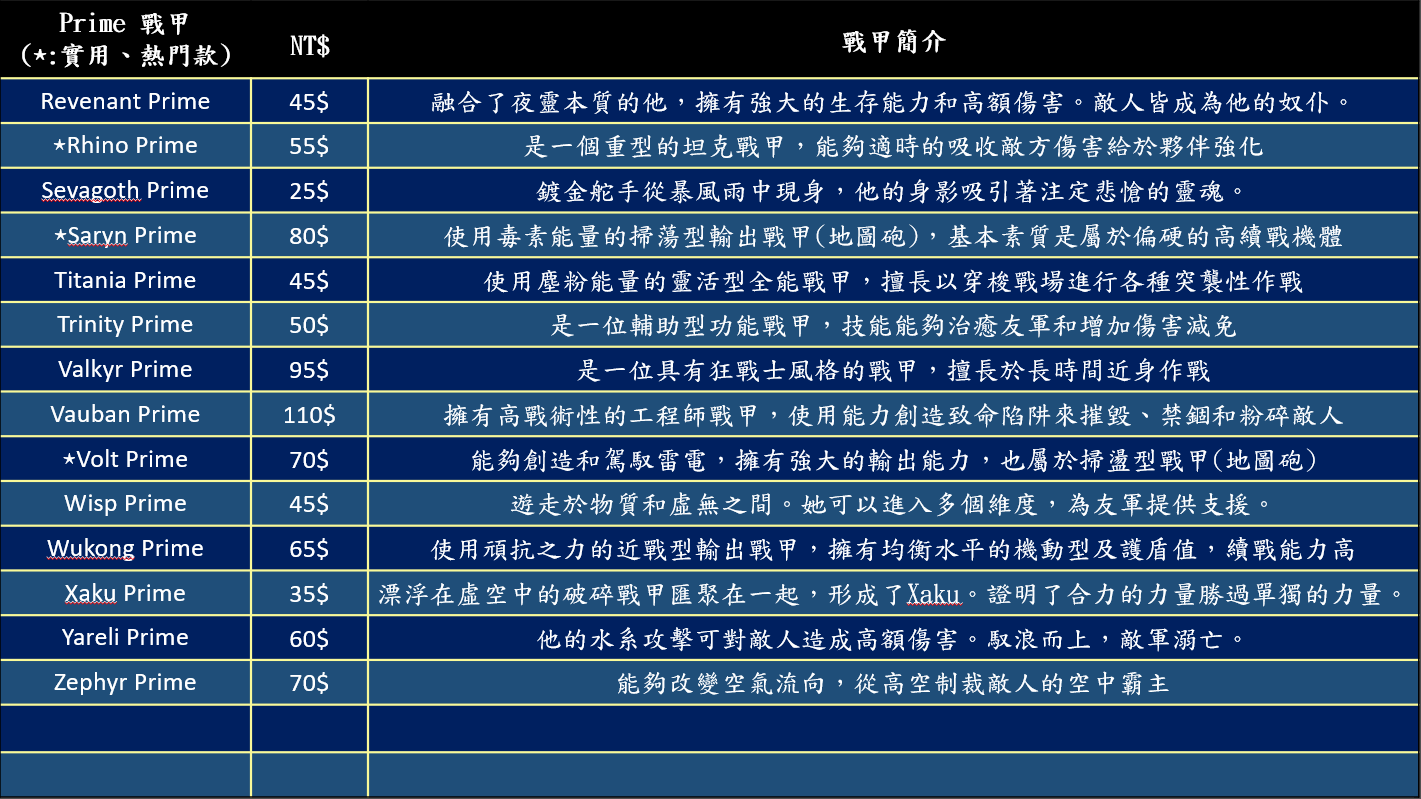 Prime版戰甲 價格如圖 依市場價格可能會有些許變動 購買先請先詢問唷~~