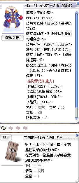 道具 🍎+12[A]海盜之王外套【亡靈的守護者卡德斯】 暴擊職業通用搭配馬爾斯LT佳