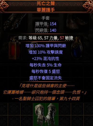 道具 【手套、歡.迎.光.臨】 傳奇👌死亡之聲.華麗護手 (盛怒不會固定流失 、護甲閃避、混沌抗性)