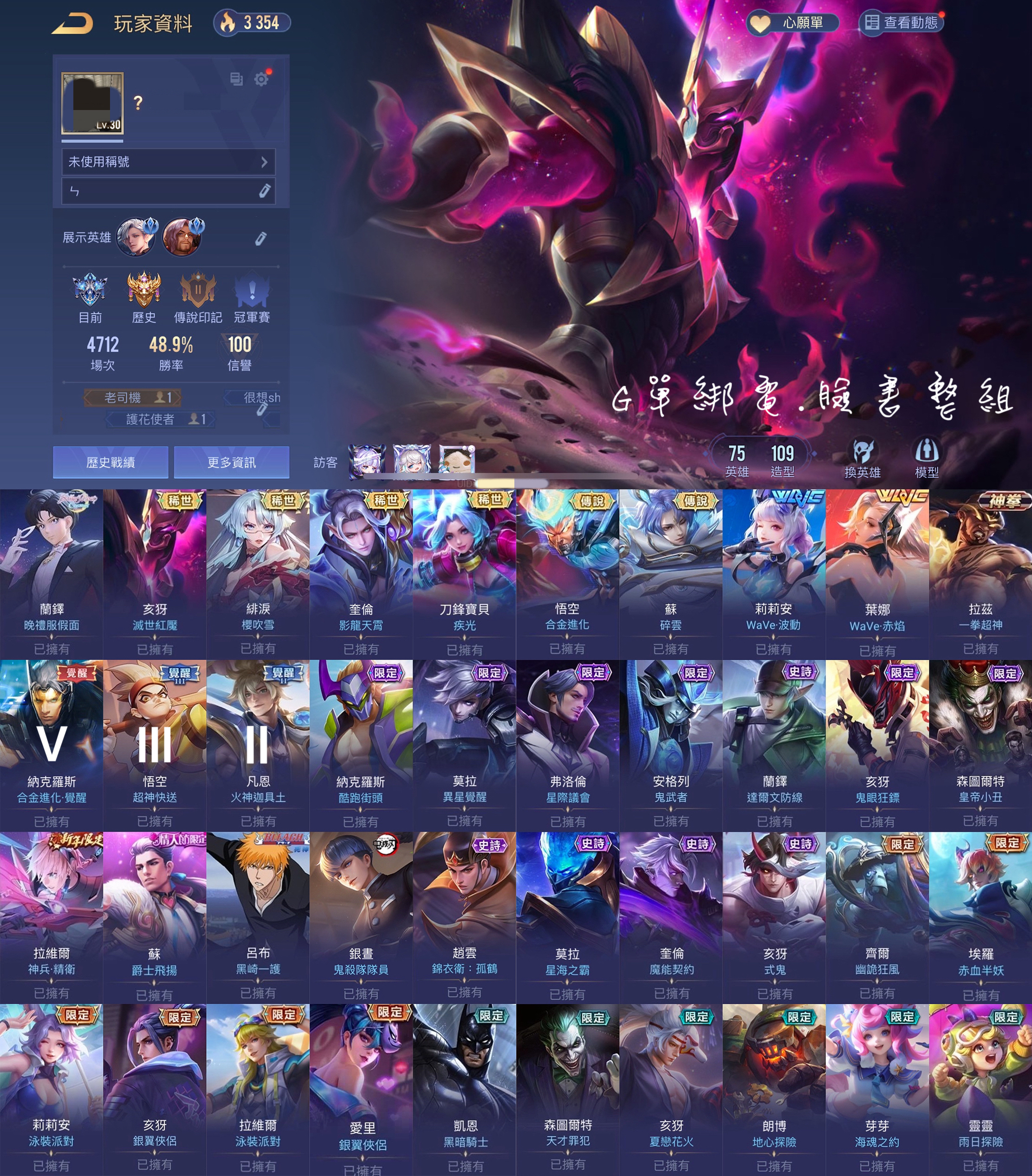 帳號 【Garena帳有綁定、戰場傳說、V9、75英、109造】 滅世.影龍.櫻吹雪.晚禮服假面.女團.WaVe.一拳超神.星際弗洛倫.異星.鬼武