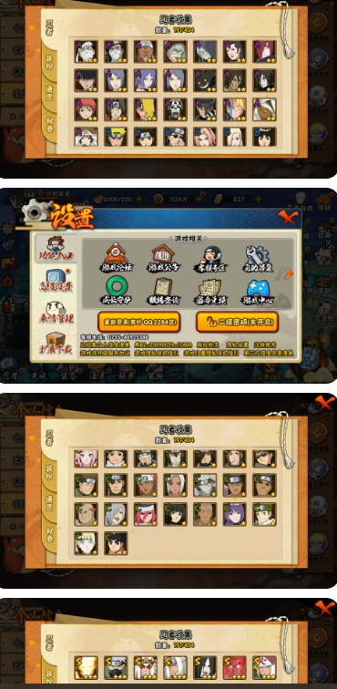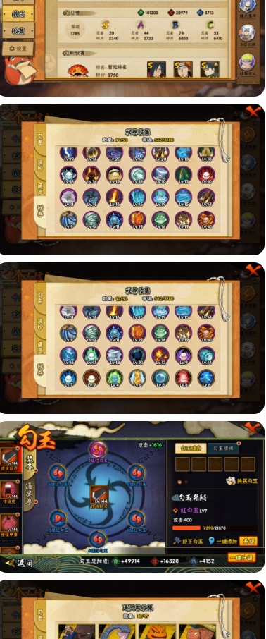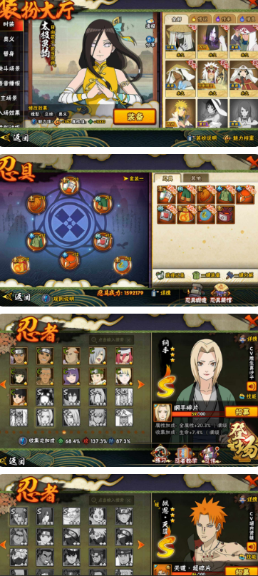 【S 級忍者】:千手柱間「穢土轉生」(3 星),宇智波鼬「穢土轉生」(3 星),宇智波斑「穢土轉生・解」(3 星),大野木「忍界大戰」(3 星),宇智波帶土「忍界大戰」(3 星),艾「忍界大戰」(3 星),宇智波鼬「須佐能乎」(3 星),宇智波止水「須佐能乎」(3 星),旗木卡卡西「須佐能乎」(3 星),千手柱間「木葉創立」(3 星),自來也「舞之豪傑」(3 星),大蛇丸 (3 星),自來也「傳說中的三忍」(3 星),波風水門 (3 星),藥師兜「仙人模式」(3 星),漩渦鳴人「九喇嘛連結」(3 星),邁特凱「死門」(3 星),佩恩「天道」(3 星),大筒木桃式 (3 星),大筒木舍人「最終章」(3 星)